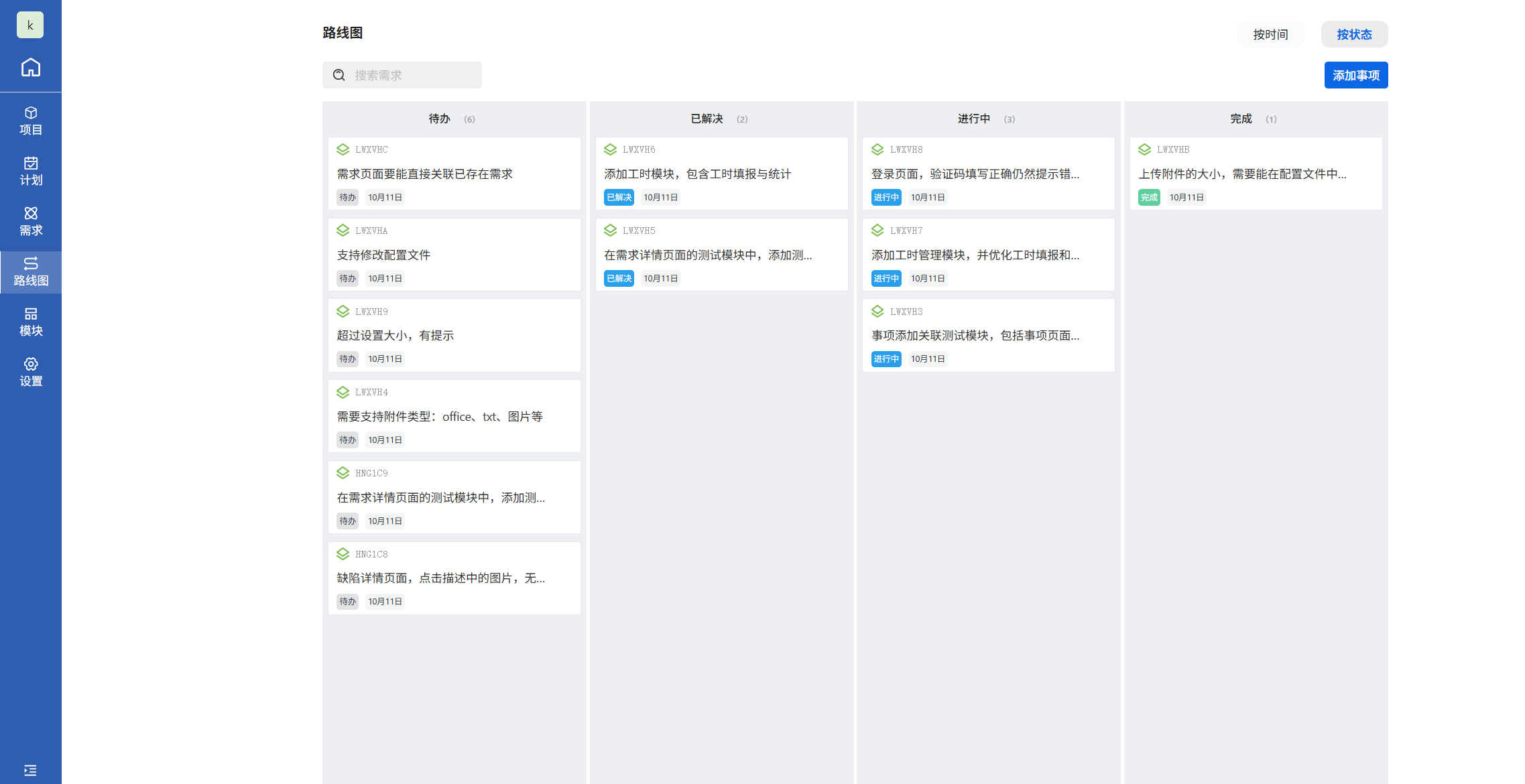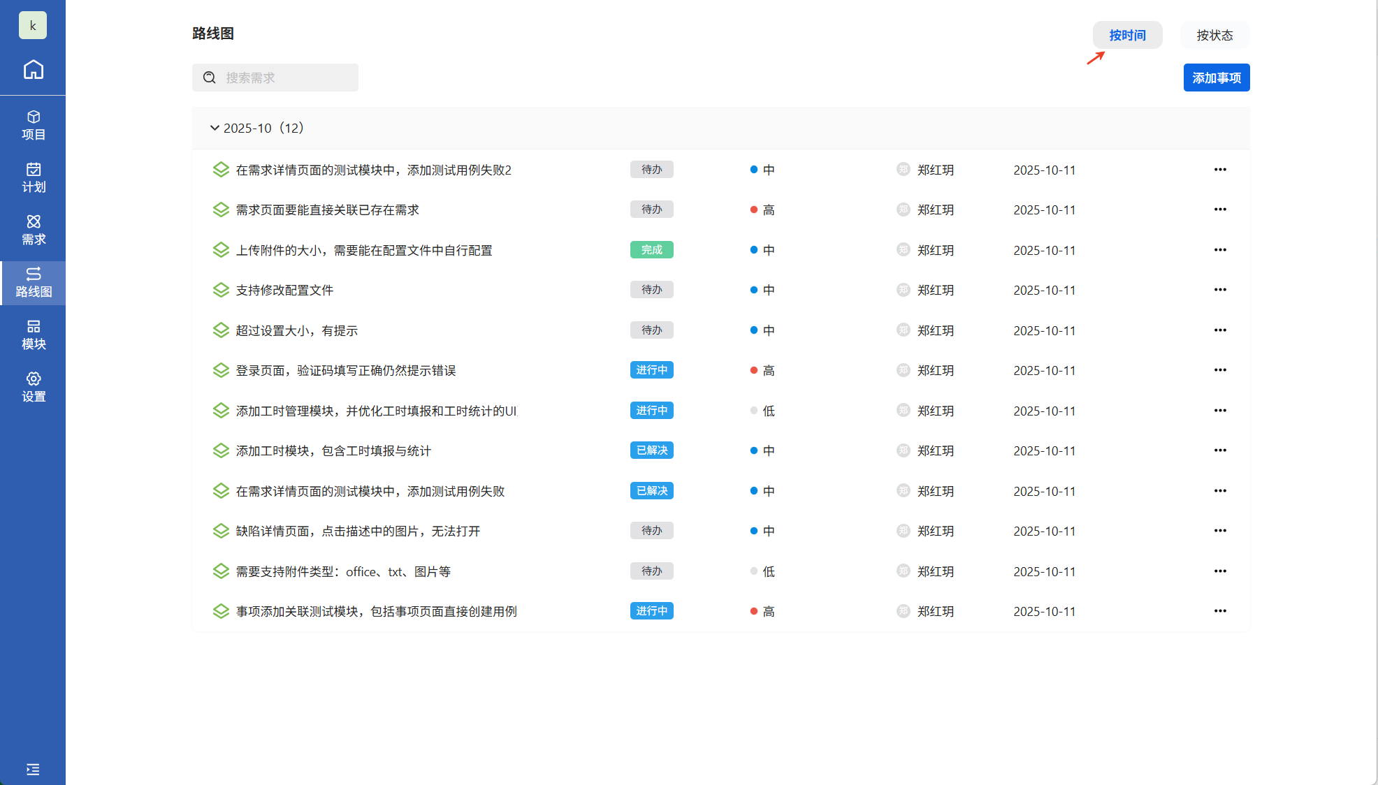 进入路线图模块,可以分别按照时间、按照状态来展示需求。