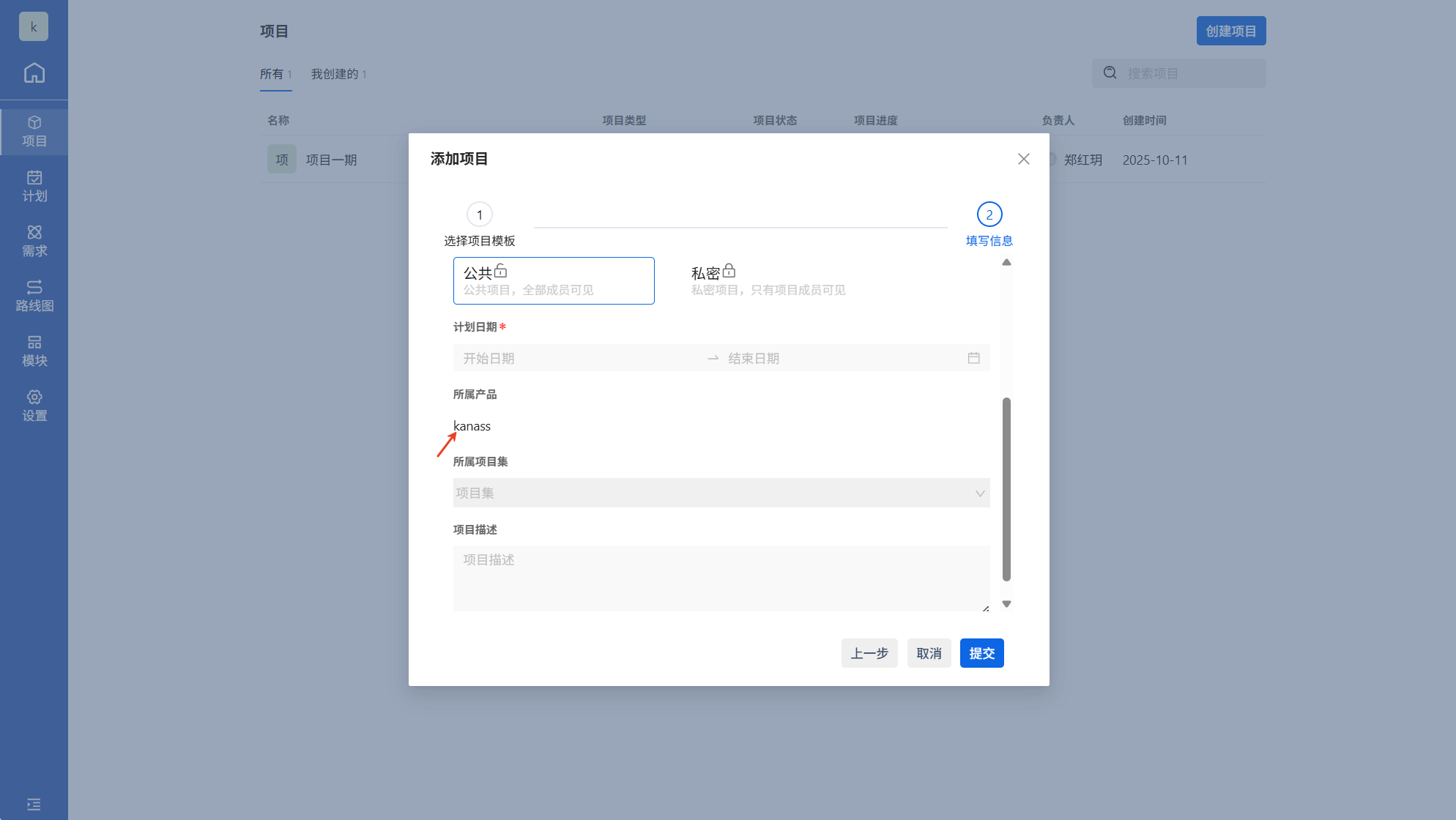 进入产品->项目模块->添加项目,此时页面中的所属产品默认显示为当前产品且无法更改。项目信息填写成功后点击提交,产品下的项目创建成功。
