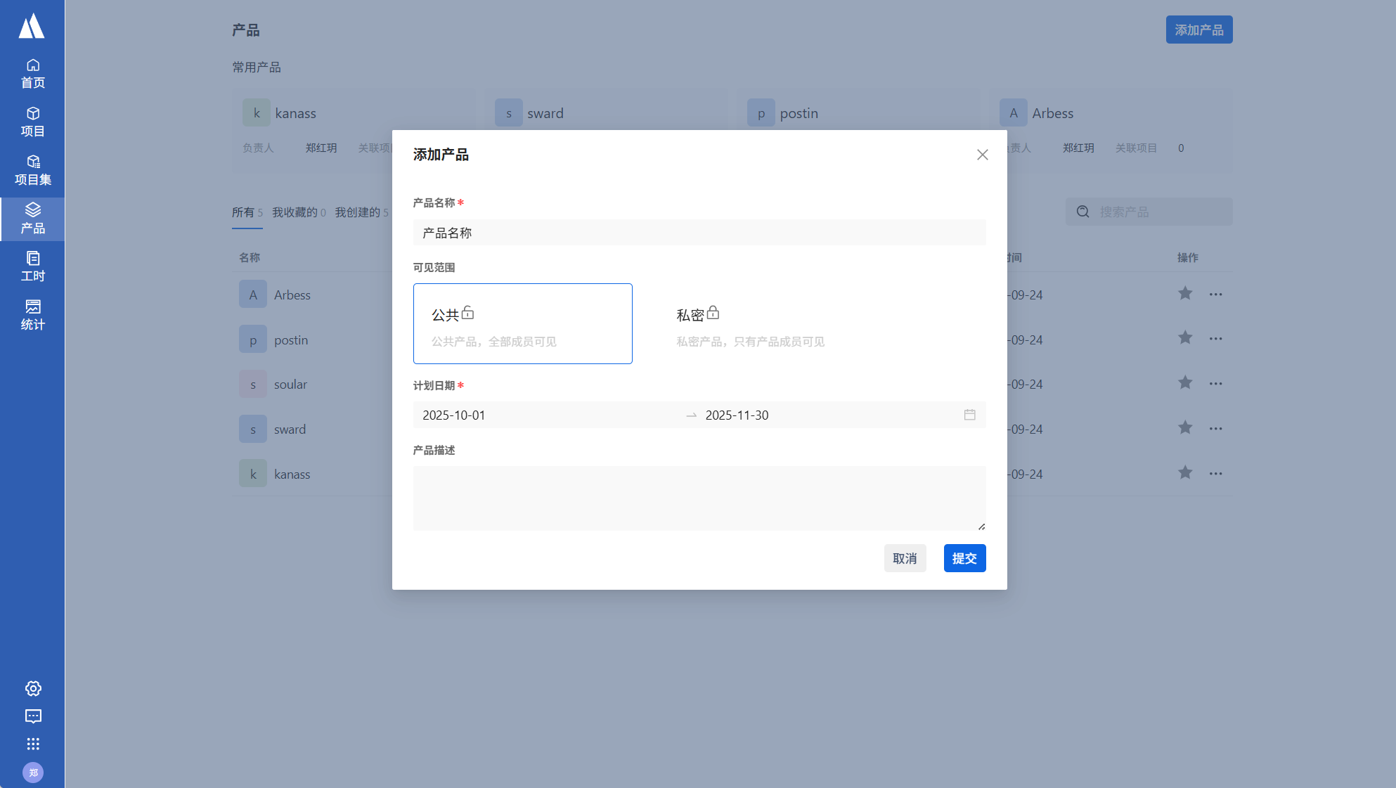 可见范围 | 公共:系统中的所有成员都可以查看并进入到产品内查看数据 私密:只有此产品的成员才可以查看到当前产品 |