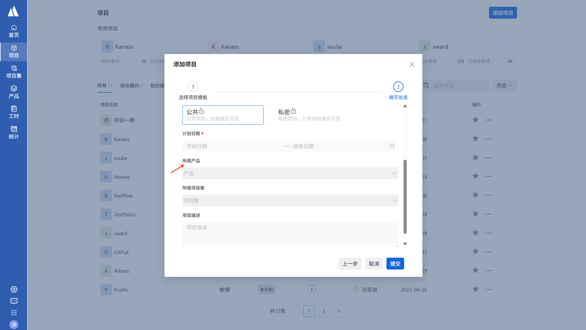 在登录系统后,直接进入项目模块->添加项目,此时填写信息页面可以选择所属产品,所属产品为非必选项。但产品与项目一旦关联,暂不支持解除关联。