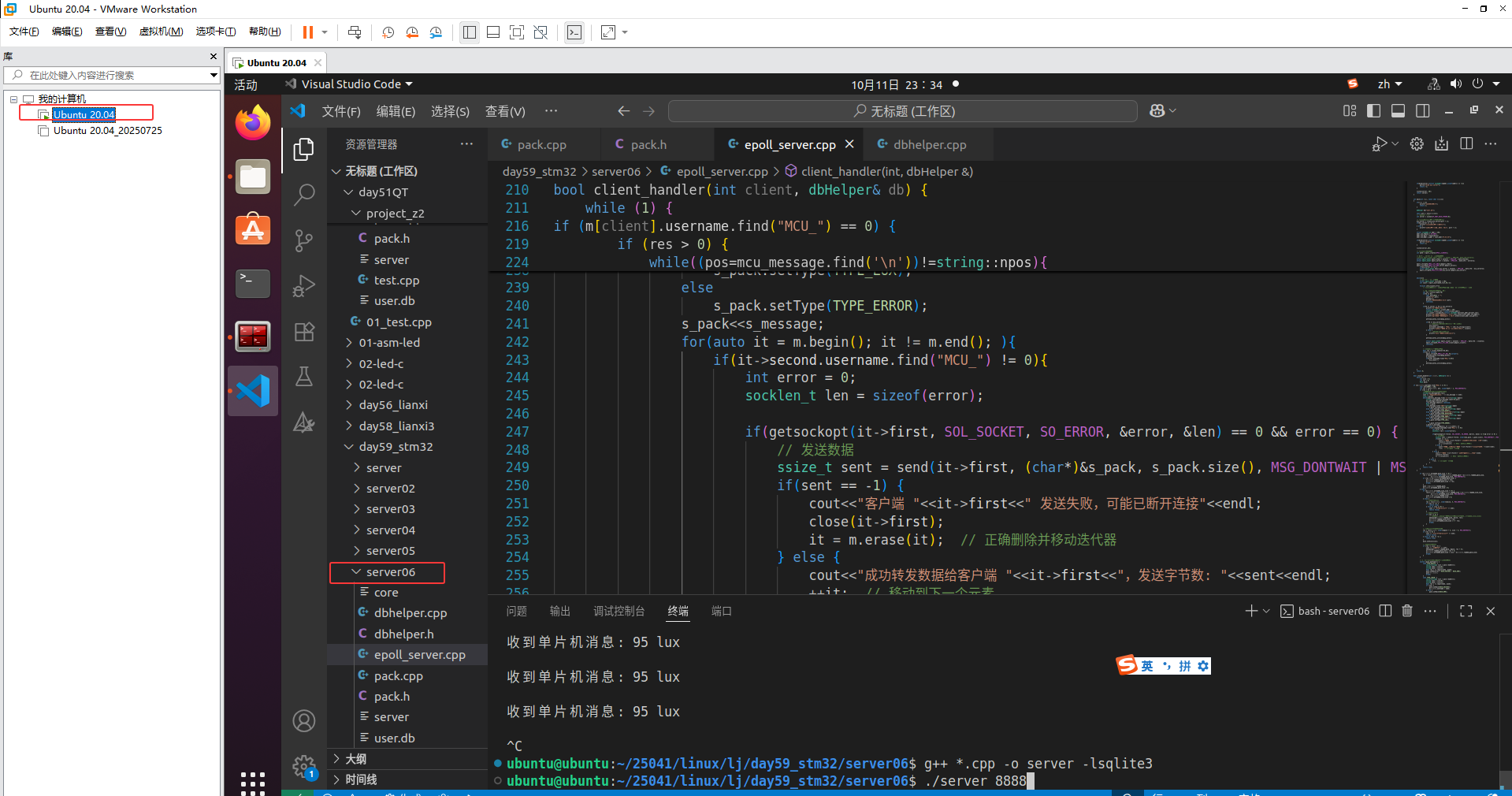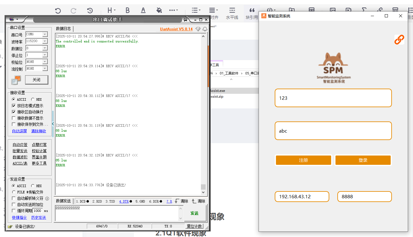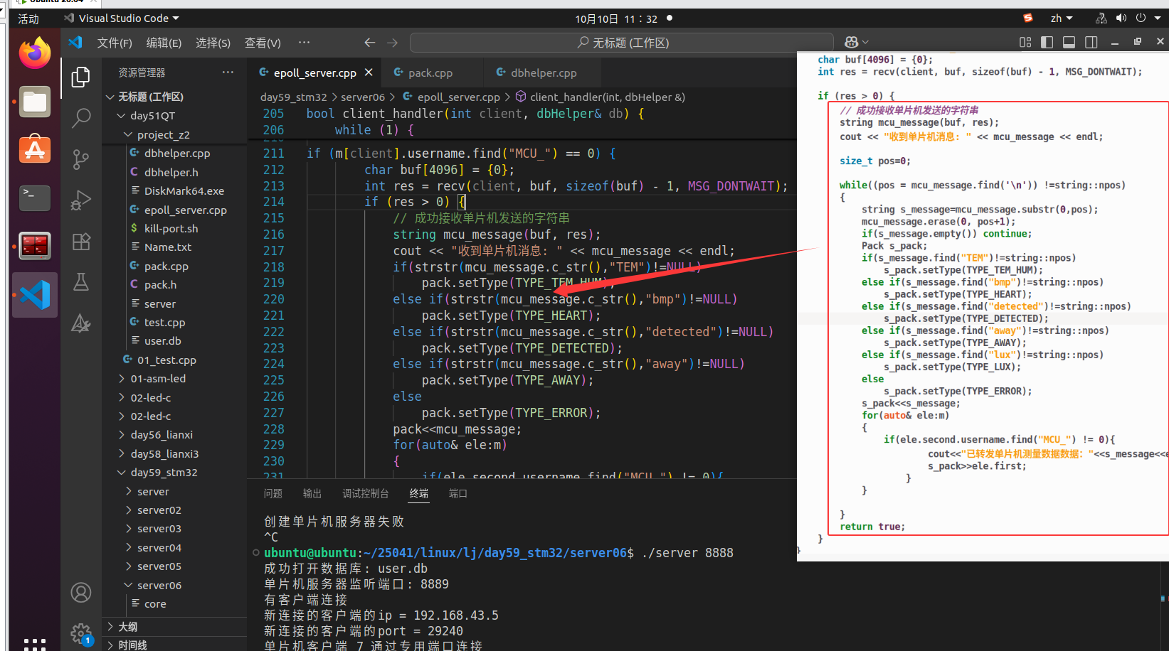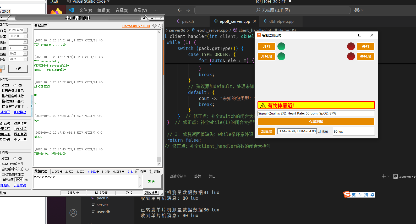 }bool client_handler(int client, dbHelper& db) {while (1) {int size = 0;int res = 0;Pack pack;if (m[client].username.find("MCU_") == 0) {char buf[4096] = {0};int res = recv(client, buf, sizeof(buf) - 1, MSG_DONTWAIT);if (res > 0) {//成功接收单片机发送来的字符串string mcu_message(buf,res);cout << "收到单片机消息: " << mcu_message << endl;size_t pos=0;while((pos=mcu_message.find('\n'))!=string::npos){string s_message=mcu_message.substr(0,pos);mcu_message.erase(0,pos+1);if(s_message.empty()) continue;Pack s_pack;if(s_message.find("TEM")!=string::npos)s_pack.setType(TYPE_TEM_HUM);else if(s_message.find("bpm")!=string::npos)s_pack.setType(TYPE_HEART);else if(s_message.find("detected")!=string::npos)s_pack.setType(TYPE_DETECTED);else if(s_message.find("away")!=string::npos)s_pack.setType(TYPE_AWAY);else if(s_message.find("lux")!=string::npos)s_pack.setType(TYPE_LUX);elses_pack.setType(TYPE_ERROR);s_pack<<s_message;for(auto it = m.begin(); it != m.end(); ){if(it->second.username.find("MCU_") != 0){int error = 0;socklen_t len = sizeof(error);if(getsockopt(it->first, SOL_SOCKET, SO_ERROR, &error, &len) == 0 && error == 0) {// 发送数据ssize_t sent = send(it->first, (char*)&s_pack, s_pack.size(), MSG_DONTWAIT | MSG_NOSIGNAL);if(sent == -1) {cout<<"客户端 "<<it->first<<" 发送失败,可能已断开连接"<<endl;close(it->first);it = m.erase(it); // 正确删除并移动迭代器} else {cout<<"成功转发数据给客户端 "<<it->first<<",发送字节数: "<<sent<<endl;++it; // 移动到下一个元素}} else {cout<<"客户端 "<<it->first<<" 套接字无效,进行清理"<<endl;close(it->first);it = m.erase(it); // 正确删除并移动迭代器}} else {++it; // 移动到下一个元素}}}return true;}}if (m[client].unreaded_pack_size != 0) {res = recv(client, (char*)&m[client].readed_pack + m[client].readed_pack_size, m[client].unreaded_pack_size, MSG_DONTWAIT);if (res != m[client].unreaded_pack_size) {m[client].readed_pack_size += res;m[client].unreaded_pack_size -= res;break;}pack = m[client].readed_pack;m[client].unreaded_pack_size = 0;} else {if (m[client].unreaded_size_size != 0) {recv(client, (char*)&m[client].readed_size + m[client].readed_size_size, m[client].unreaded_size_size, MSG_DONTWAIT);size = m[client].readed_size;m[client].unreaded_size_size = 0;} else {// 读取4字节sizeres = recv(client, (char*)&size, 4, MSG_DONTWAIT);if (res == -1) {return true;} else if (res == 0) {cout << "4字节recv结束" << endl;return false;}// 处理size分包if (res != 4) {// 修正点:原memcpy参数错误,应拷贝res字节(而非readed_size_size)memcpy(&m[client].readed_size, &size, res); m[client].readed_size_size = res;m[client].unreaded_size_size = 4 - res;break;}}// 读取size-4字节的包内容res = recv(client, (char*)&pack + 4, size - 4, MSG_DONTWAIT);if (res == 0) {cout << "size-4字节recv结束" << endl;return false;} else if (res == -1) {return true;}pack.setSize(size);// 处理包内容分包if (res != size - 4) {cout << "发生分包" << endl;memcpy(&m[client].readed_pack, &pack, res + 4);m[client].readed_pack_size = res + 4;m[client].unreaded_pack_size = size - m[client].readed_pack_size;break;}}// 2. 修复switch大括号不匹配:补全闭合}switch (pack.getType()) {case TYPE_REGIST: {vector<string> list = pack.readAll();string name = list[0];string pswd = list[1];bool res = db.regist(name, pswd);pack.setBack(res ? BACK_SUCCESS : BACK_ERR);pack >> client;break;}case TYPE_LOGIN: {vector<string> list = pack.readAll();string name = list[0];string pswd = list[1];bool res = db.login(name, pswd);if (res) {pack.setBack(BACK_SUCCESS);m[client].username = name;} else {pack.setBack(BACK_ERR);}pack >> client;break;}case TYPE_ORDER: {if(mcu_count==0){cout<<"当前无被控端连接"<<endl;pack.setType(TYPE_NOMCU);pack>>client;break;}vector<string> list = pack.readAll();cout << "收到客户端发来的命令:" << list[0] << endl;string command = list[0];cout << "当前在线客户端数量:" << m.size() << endl;// 发送给所有MCU客户端for (auto& ele : m) {if (ele.second.username.find("MCU_") == 0) {ssize_t sent = send(ele.first, command.c_str(), command.length(), 0);cout << "已发送指令给单片机 " << ele.first << ": " << command << " (长度:" << command.length() << ", 实际发送:" << sent << ")" << endl;}}break;}// 建议添加default,处理未知类型的包default: {cout << "未知的包类型:" << pack.getType() << endl;break;}} // 修正点:补全switch的闭合大括号} // 修正点:补全while(1)的闭合大括号// 3. 修复返回值缺失:while循环意外退出时的默认返回值return false;