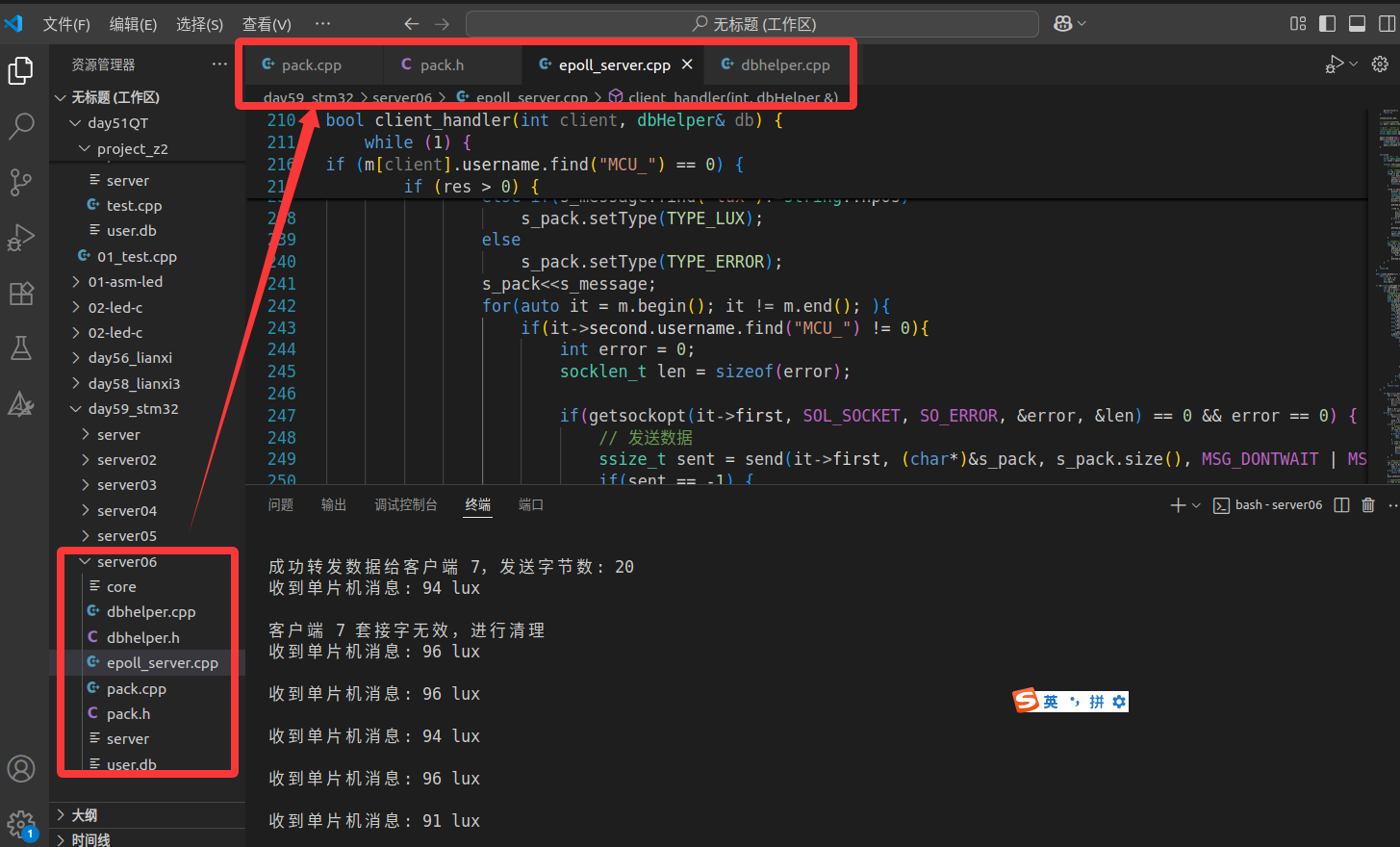 {if(argc < 2){printf("请末端口号\n");return 1;}dbHelper db("user.db");short port = atoi(argv[1]);// "abc123" -> 0int server = socket(AF_INET,SOCK_STREAM,0);// 创建单片机专用服务器(端口号+1)mcu_server = create_mcu_server(port + 1);if(mcu_server == -1) {printf("创建单片机服务器失败\n");} else {printf("单片机服务器监听端口: %d\n", port + 1);}struct sockaddr_in addr = {0};addr.sin_family = AF_INET; addr.sin_port = htons(port);addr.sin_addr.s_addr = inet_addr("0.0.0.0");if(bind(server,(struct sockaddr*)&addr,sizeof(addr)) == -1){perror("bind");return 1;}listen(server,10);// 创建epoll监视列表int epfd = epoll_create1(EPOLL_CLOEXEC);// 将 0 和 server 添加进入监视列表//struct epoll_event epoll_stdin = {.events = EPOLLIN ,data:{fd:server}};struct epoll_event epoll_stdin = {events : EPOLLIN , data:{fd:0}};struct epoll_event epoll_server = {events : EPOLLIN , data:{fd : server}};epoll_ctl(epfd,EPOLL_CTL_ADD,0,&epoll_stdin);epoll_ctl(epfd,EPOLL_CTL_ADD,server,&epoll_server);if(mcu_server != -1) {struct epoll_event epoll_mcu_server = {events : EPOLLIN , data:{fd : mcu_server}};epoll_ctl(epfd,EPOLL_CTL_ADD,mcu_server,&epoll_mcu_server);}while(1){// 提前准备一个激活列表struct epoll_event list[20] = {0};int count = epoll_wait(epfd,list,20,-1);for(int i=0;i<count;i++){// list里面全都是激活的描述符,最多判断一下 ,以何种方式激活的// 将激活的具体描述符单独取出int fd = list[i].data.fd;if(fd == 0){char buf[1024] = "";scanf("%s",buf);getchar();printf("键盘输入数据:%s\n",buf);continue;}if(fd == server || fd == mcu_server){printf("有客户端连接\n");struct sockaddr_in client_addr = {0};socklen_t client_len = sizeof(client_addr);int client = accept(fd,(struct sockaddr*)&client_addr,&client_len);printf("新连接的客户端的ip = %s\n",inet_ntoa(client_addr.sin_addr));printf("新连接的客户端的port = %d\n",ntohs(client_addr.sin_port));pthread_mutex_lock(&map_mutex);if(fd == mcu_server) {// 单片机专用端口的连接,自动标记为单片机mcu_count++;m[client].username = "MCU_" + std::to_string(client);printf("单片机客户端 %d 通过专用端口连接\n", client);} else {// 主端口的连接,等待登录printf("普通客户端,等待登录\n");}pthread_mutex_unlock(&map_mutex);struct epoll_event epoll_client = {events : EPOLLIN , data:{fd : client}};epoll_ctl(epfd,EPOLL_CTL_ADD,client,&epoll_client);continue;}// 剩下的都是客户端描述符bool res = client_handler(fd,db);if(res == false){epoll_ctl(epfd,EPOLL_CTL_DEL,fd,nullptr);pthread_mutex_lock(&map_mutex);m.erase(fd);if(m[fd].username.find("MCU_")==0){mcu_count--;}pthread_mutex_unlock(&map_mutex);}}}return 0;