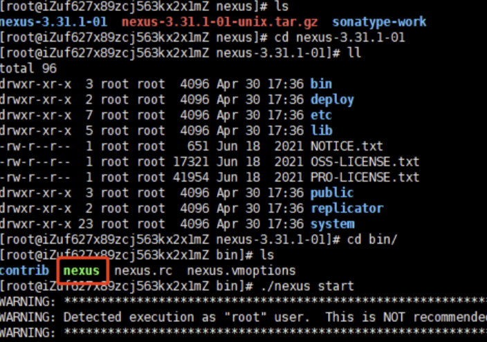 - 解压过后就可以直接启动了,不需要安装操作。进入到解压目录 nexus-3.31.1-01 中,再进入到 bin 目录,其中的可执行文件 nexus 就是启动程序。