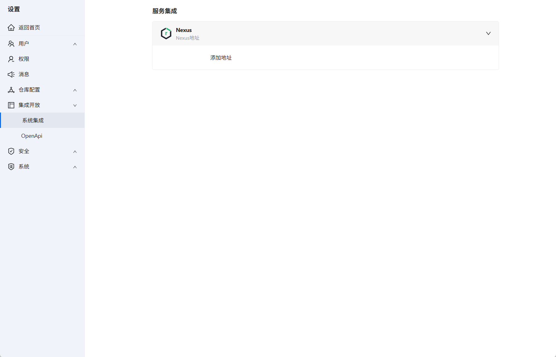 2.进入服务集成后点击添加地址,根据内容输入对应的Nexus地址、账号、密码点击确定即可