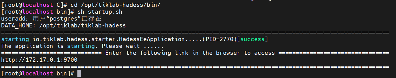 - 启动:系统默认安装路径为/opt目录,进入/opt/tiklab-gitpuk/bin目录下,执行./hadess start即可启动成功。