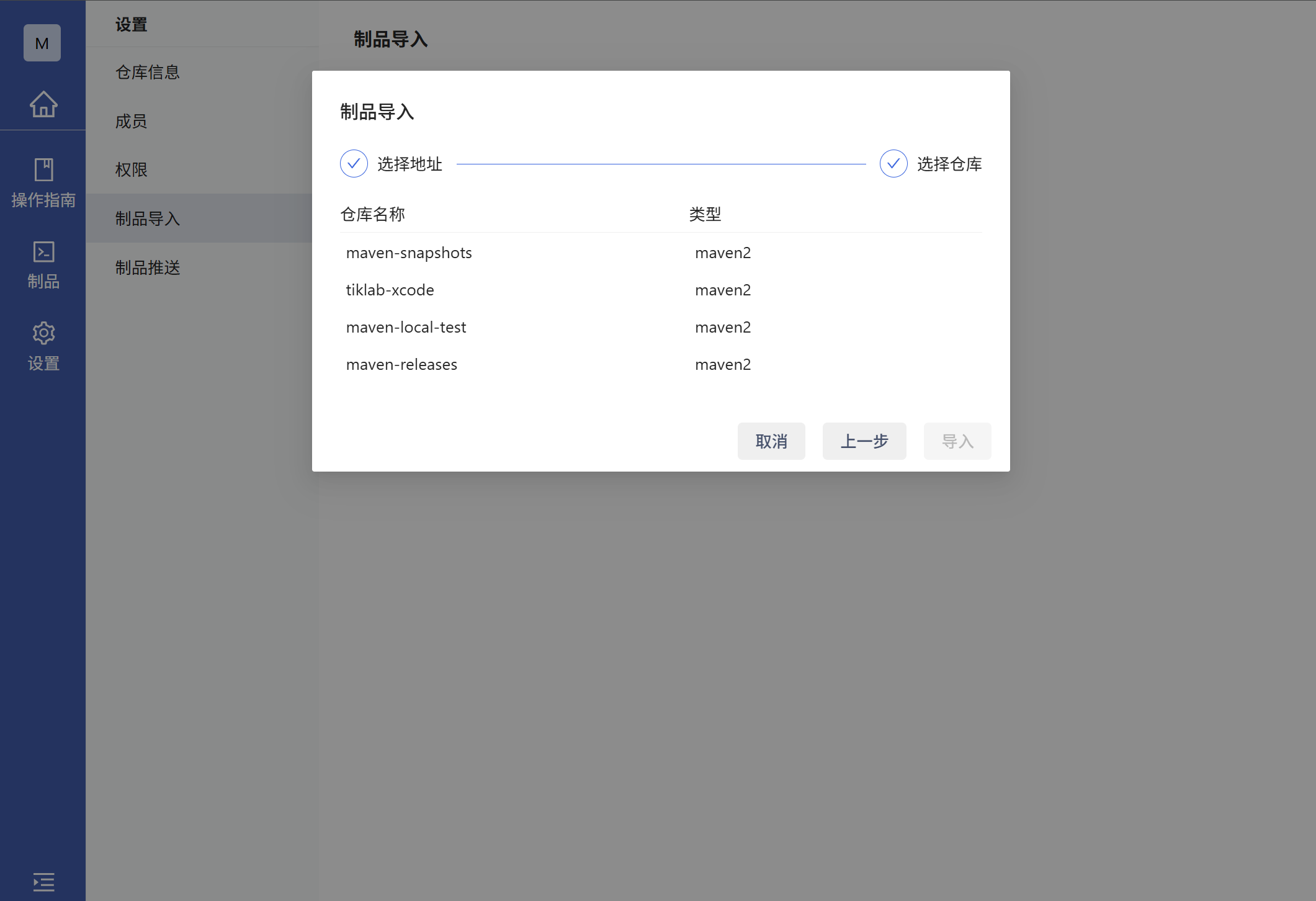 4.选择你要导入的地址与仓库选择后点击导入即可,拉取成功后即可在制品中查看