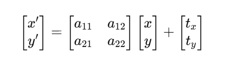 仿射变换是一种线性变换与平移的组合。对于任意二维空间点 ((x, y)),经过仿射变换后得到的新坐标 ((x', y')) 可表示为: