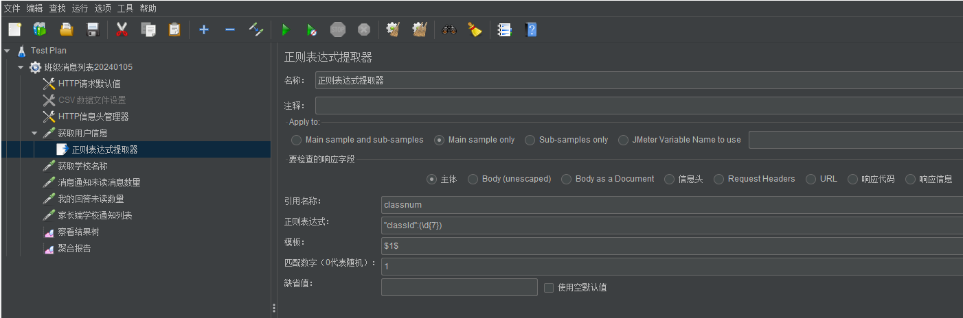 下图中使用正则表达式提取的获取用户信息接口中的返回值中的classid信息,正则表达式可以去搜索一下规则,按规则填写就可以,实在不会写正则表达式的,可以去deepseek一下,让d老师帮你把正则写出来