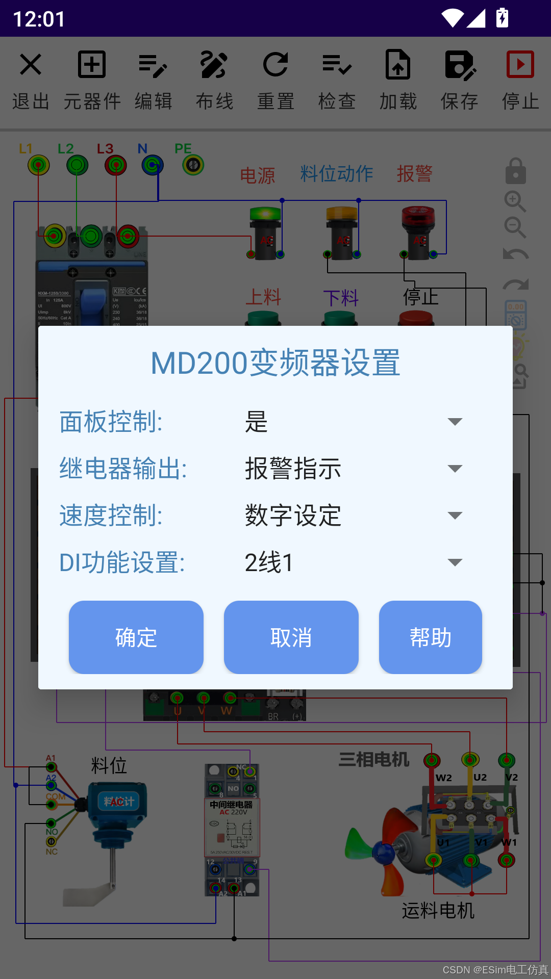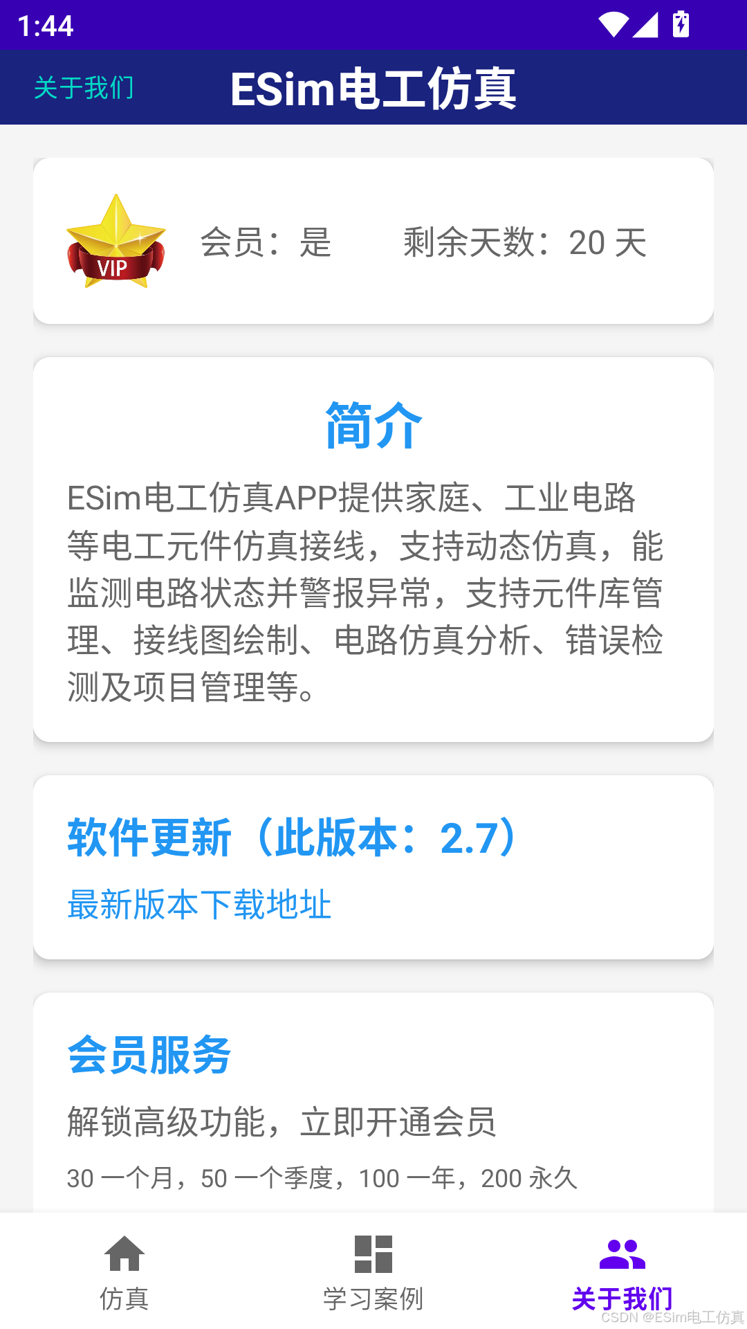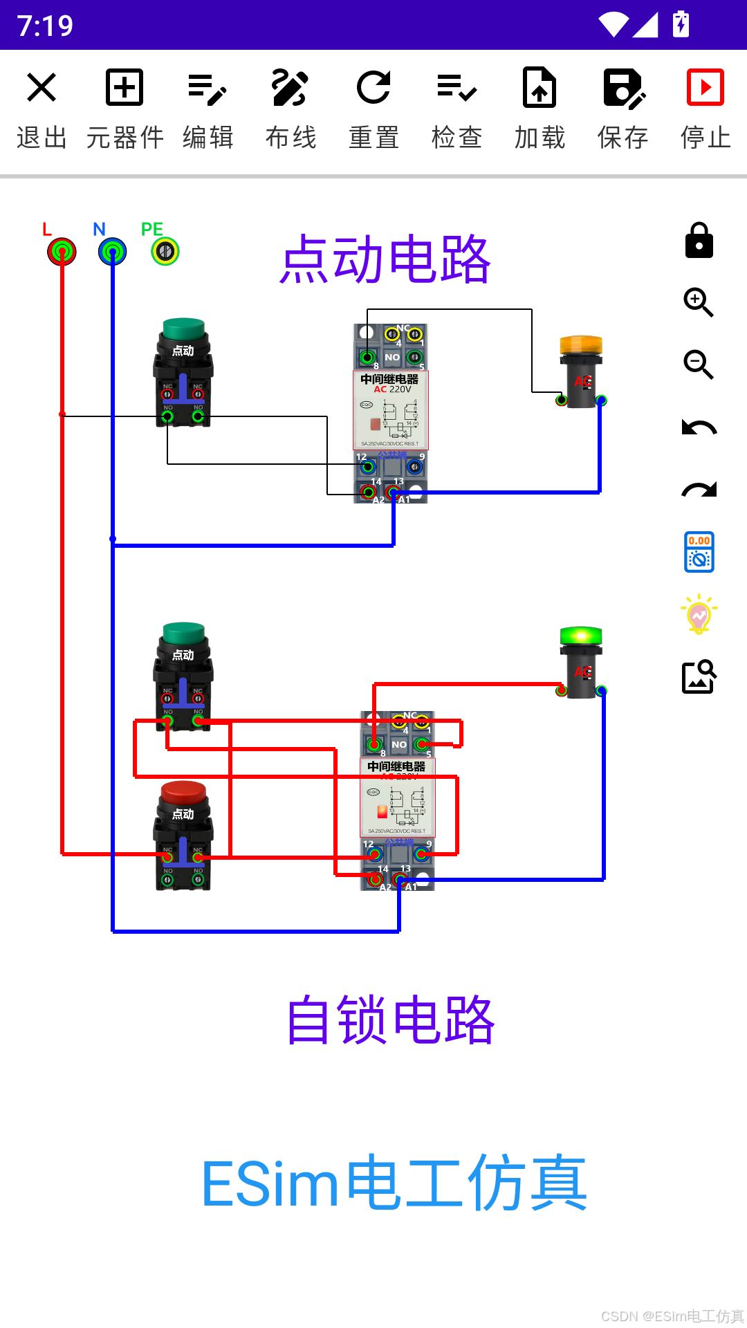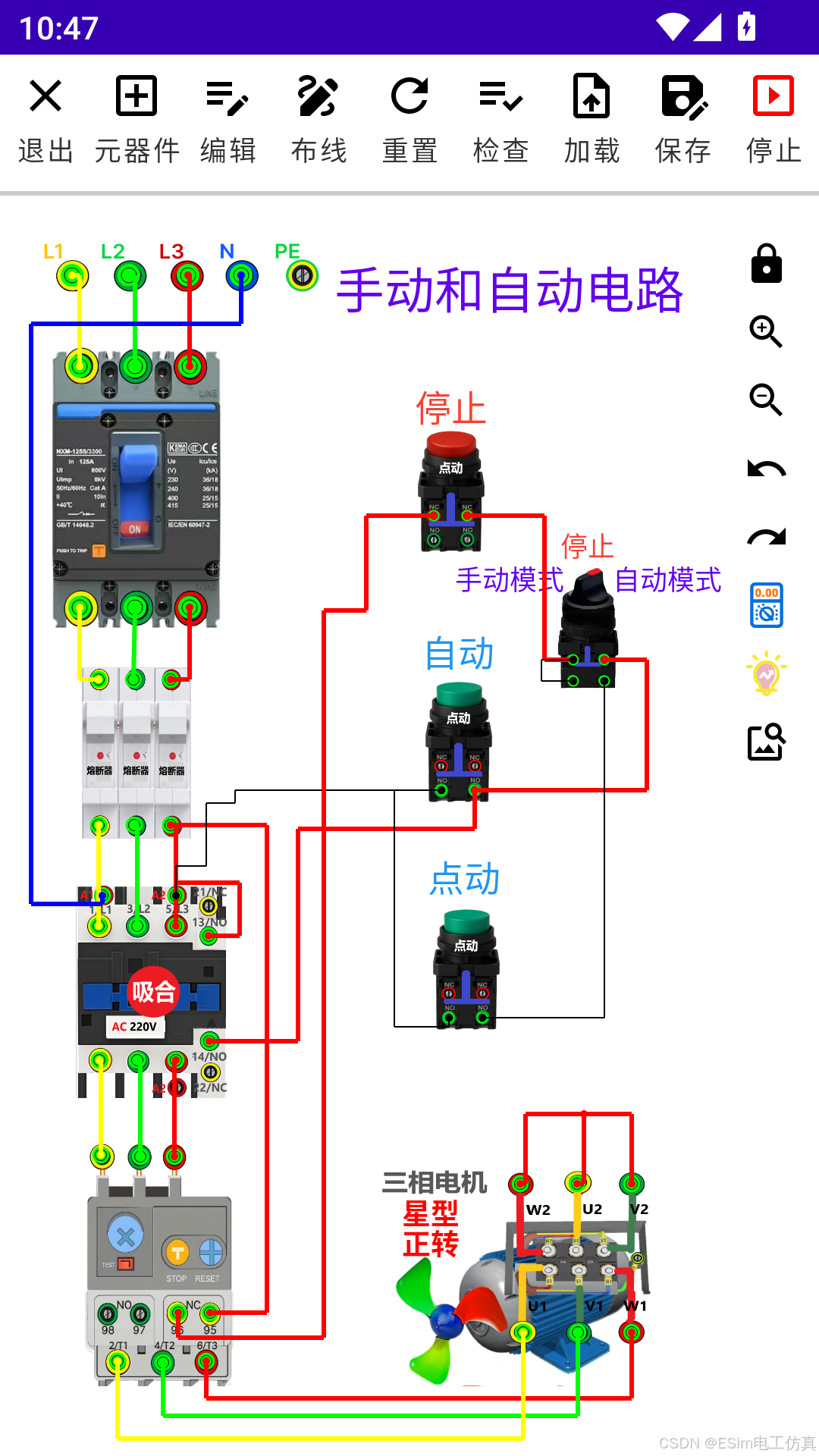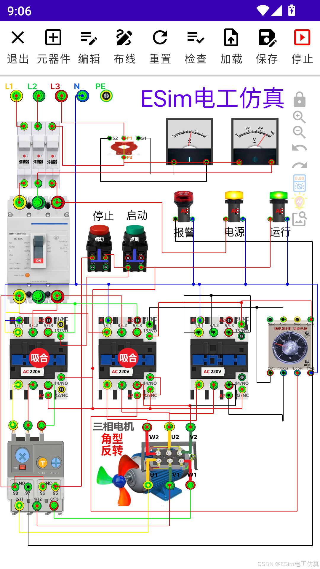 ESim电工仿真是一款专为电工知识学习与技能提升打造的仿真工具,目前已推出安卓版本和电脑版本(本手册是安卓版本手册),并实现了90%以上核心功能的免费开放。它不仅支持家庭电路、低压控制回路的基础搭建,还能模拟工业现场常见的复杂控制逻辑,如电机正反转、星三角启动、液位控制、温控系统以及PLC与变频器的应用等,真正实现了“理论+仿真+实践”一体化的学习模式。