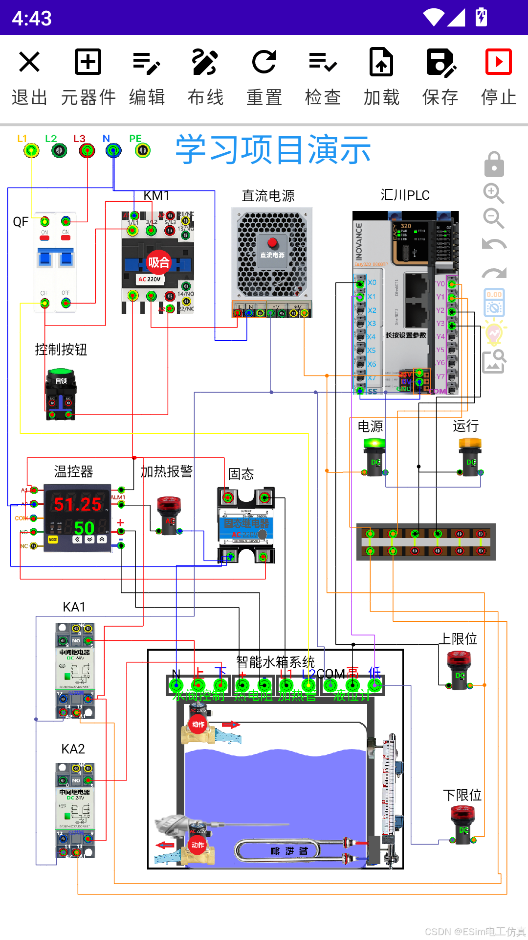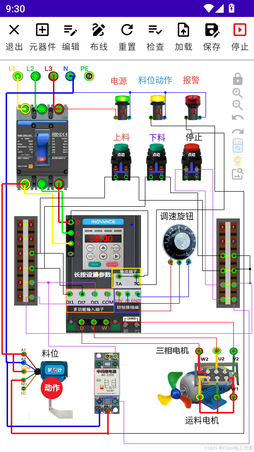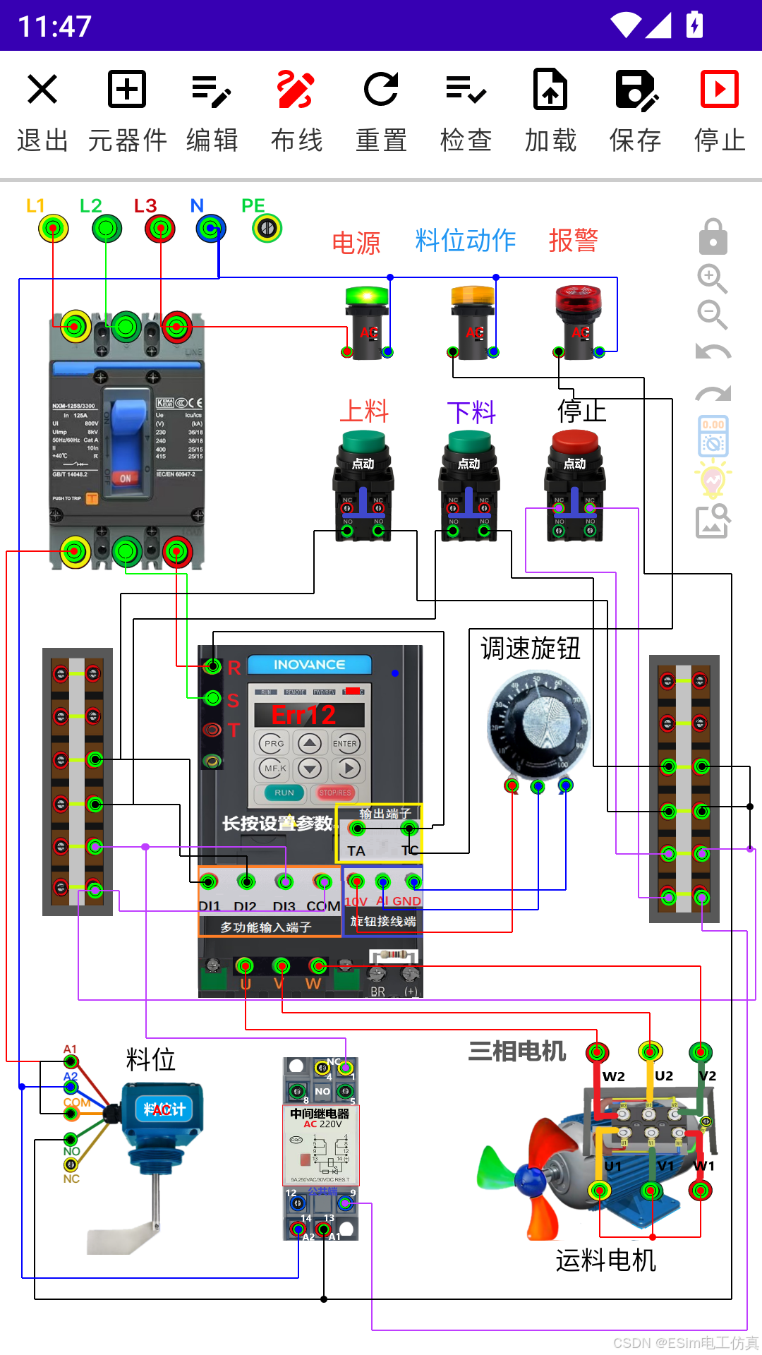 通过直观的拖拽式操作、实时电路仿真、故障注入与诊断、万用表测量、放大镜精准接线等功能,ESim电工仿真让用户可以在手机或平板上随时随地进行电路设计与调试。无论是备考低压电工实操考试,还是深入理解PLC控制逻辑,亦或是练习变频器的端子控制与故障排查,ESim电工仿真都提供了安全、灵活且高效的虚拟实训环境。