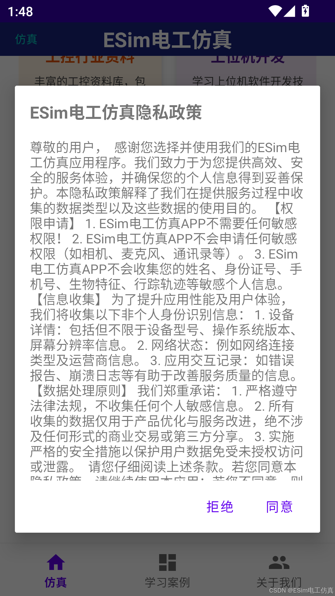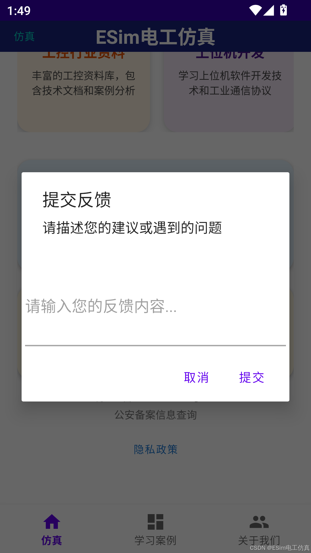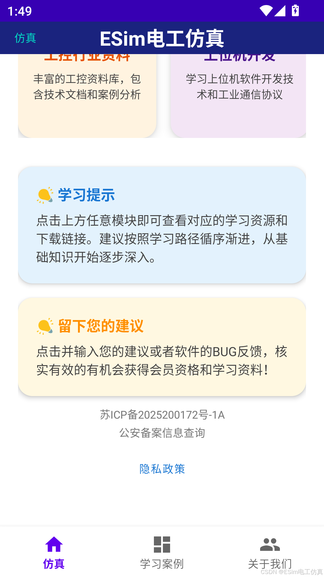 在主页的底部有隐私政策、备案号、公安备案信息等,ESim电工仿真没有申请任何额外权限,以默认的基本权限运行,不会收集任何用户隐私!