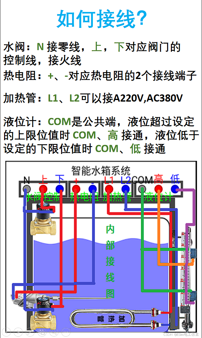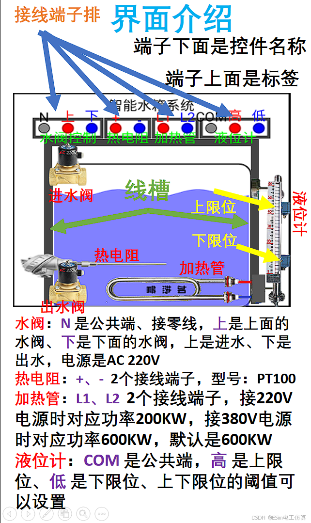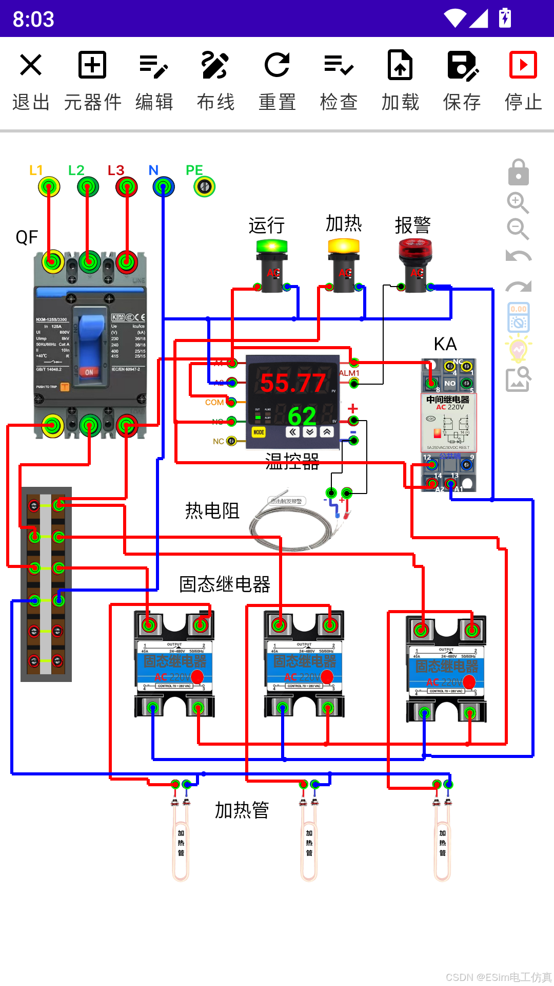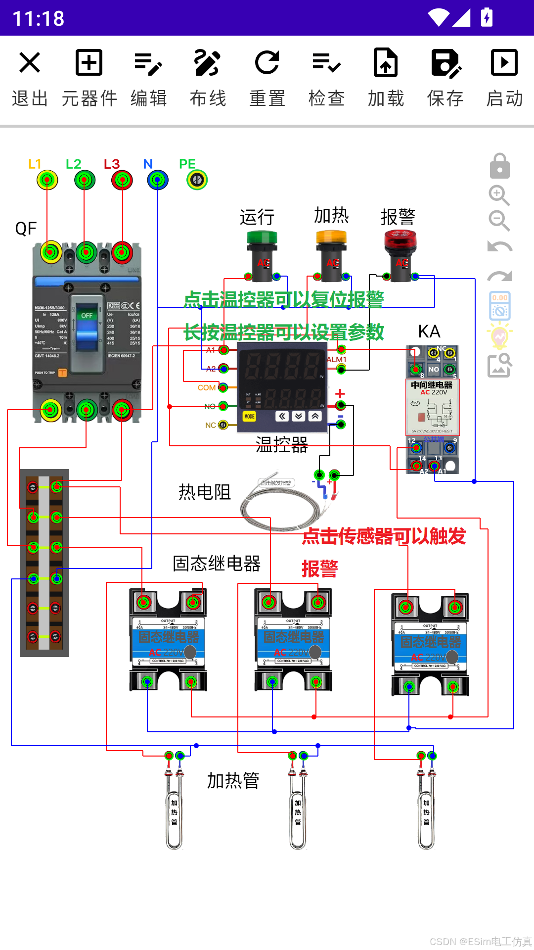 • 电路:温控器的接线仿真• 学习要点:温控器的接线、温度的设置等• 注意事项:加热管的接线以及参数的设置等
