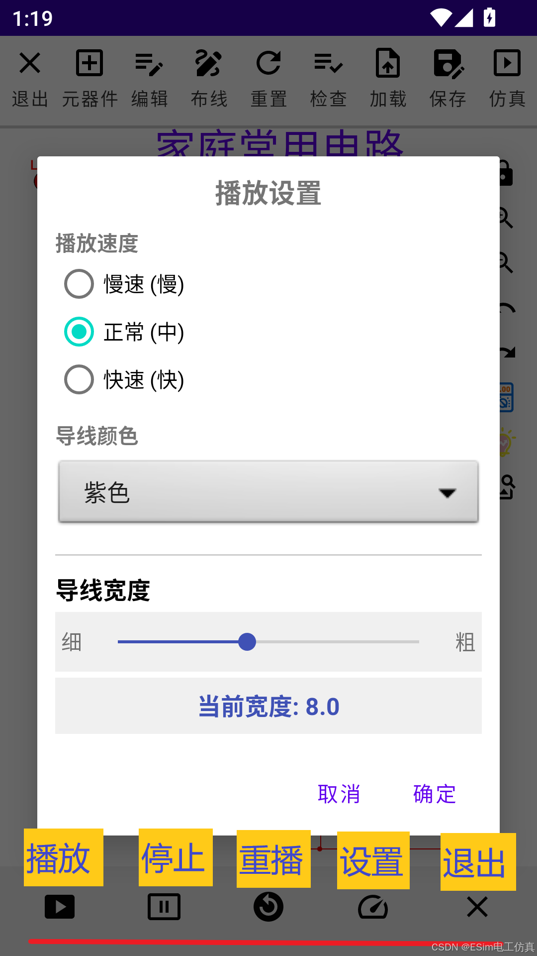 进入示教模式后我们可以设计电路或者加载已有的电路,然后在底部按钮点击设置按钮进入示教参数设置,设置完成后即可点击播放按钮即可进行示教播放
