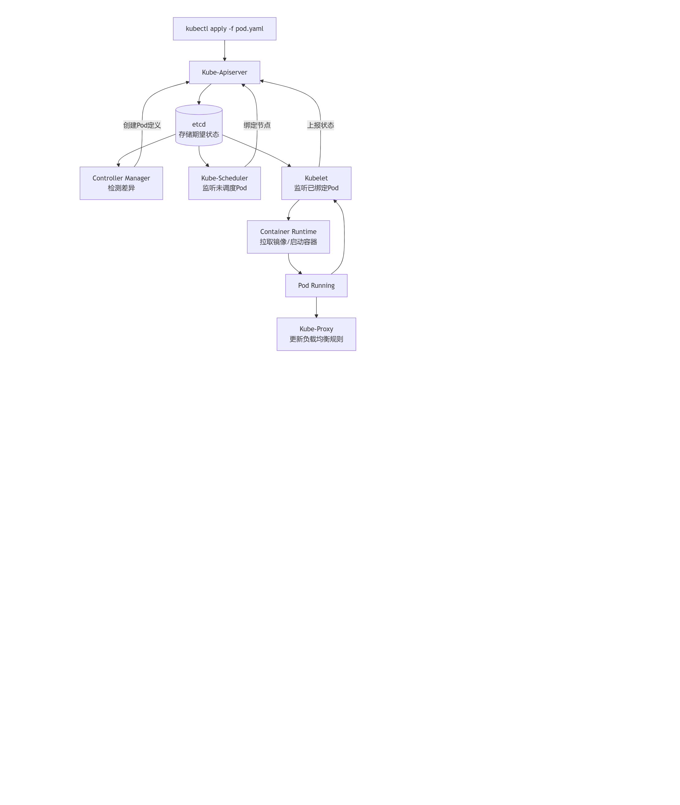 黄金三角数据流: 整个系统的核心数据流是一个 "监听-判断-操作" 的循环: 控制器/调度器/Kubelet --(监听)--> Apiserver/etcd --(判断差异)--> 控制器/调度器/Kubelet --(执行操作)--> Apiserver --(更新状态)--> etcd。