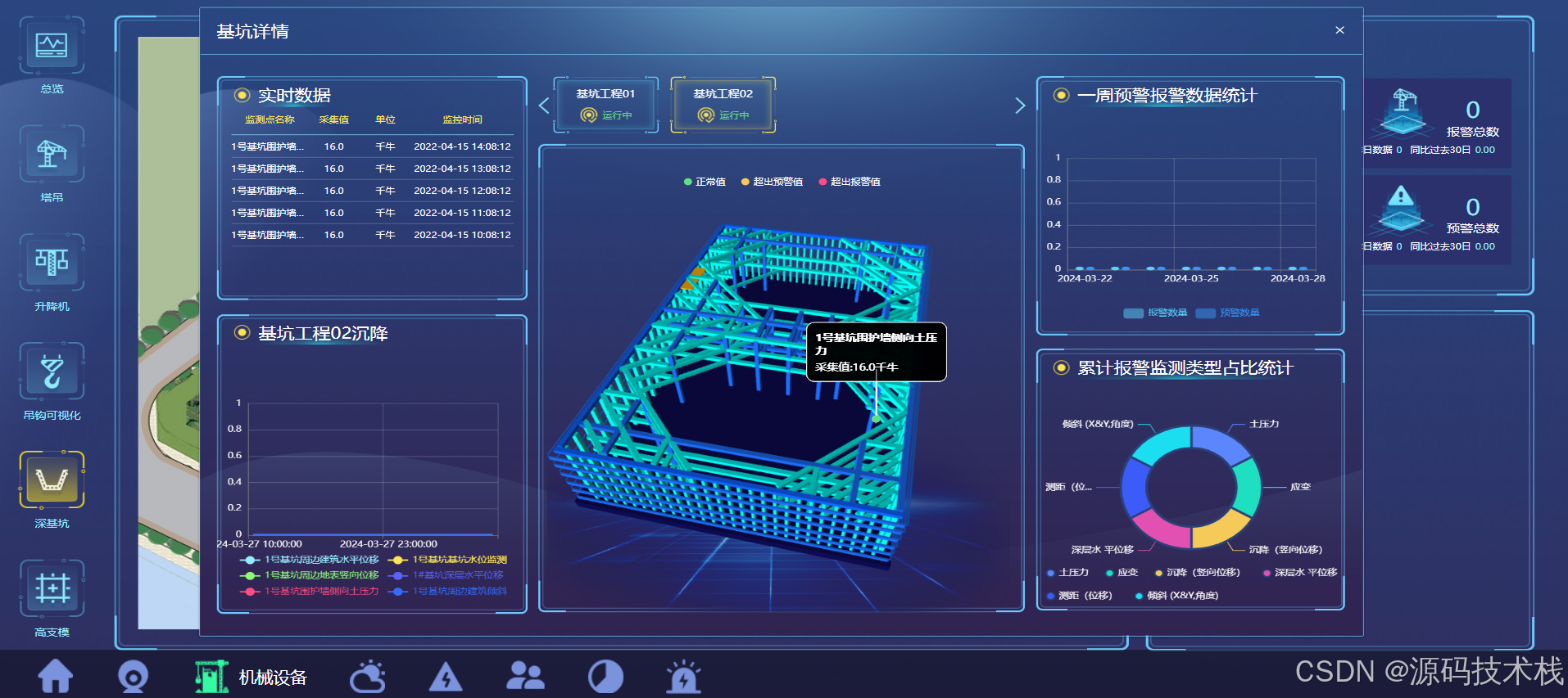 对深基坑的支护结构顶部水平位移、深层水平位移、立柱顶水平位移、沉降、支撑结构内力和锚索应力等数据实时监测,并对超警戒数据进行报警。