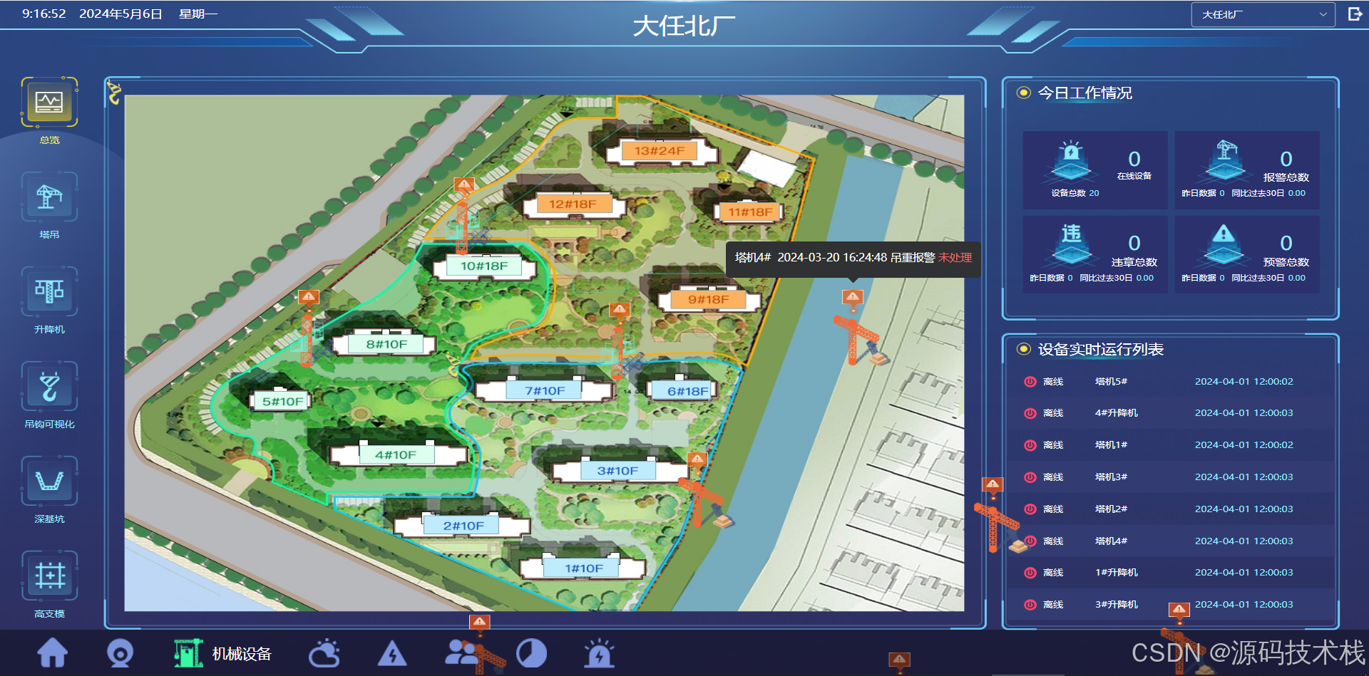 能够对重要运行参数进行实时监视,包含重量、力矩、高度、幅度、回转角度、运行速度、风速;当塔机出现危险操作时,实时报警数据将推送至智慧工地平台。