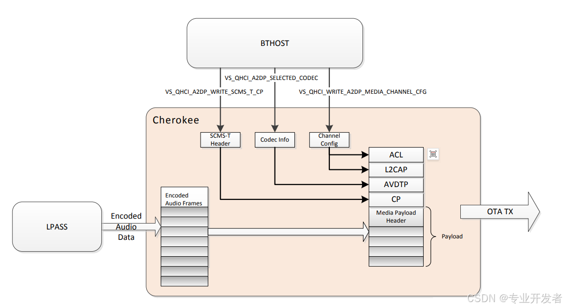 蓝牙主机(BTHOST)会在蓝牙控制器中配置 A2DP 信息,同时蓝牙控制器接收编码后的音频并将其打包成蓝牙数据包。具体流程为:LPASS 提供编码后的音频数据,进入 Cherokee 模块后,结合 BTHOST 传递的 SCMS - T 头部、编解码器信息、通道配置等,经过 ACL、L2CAP、AVDTP、CP 等协议层处理,添加媒体有效载荷头部,最终形成有效载荷,通过 OTA TX(空中传输发送)出去。