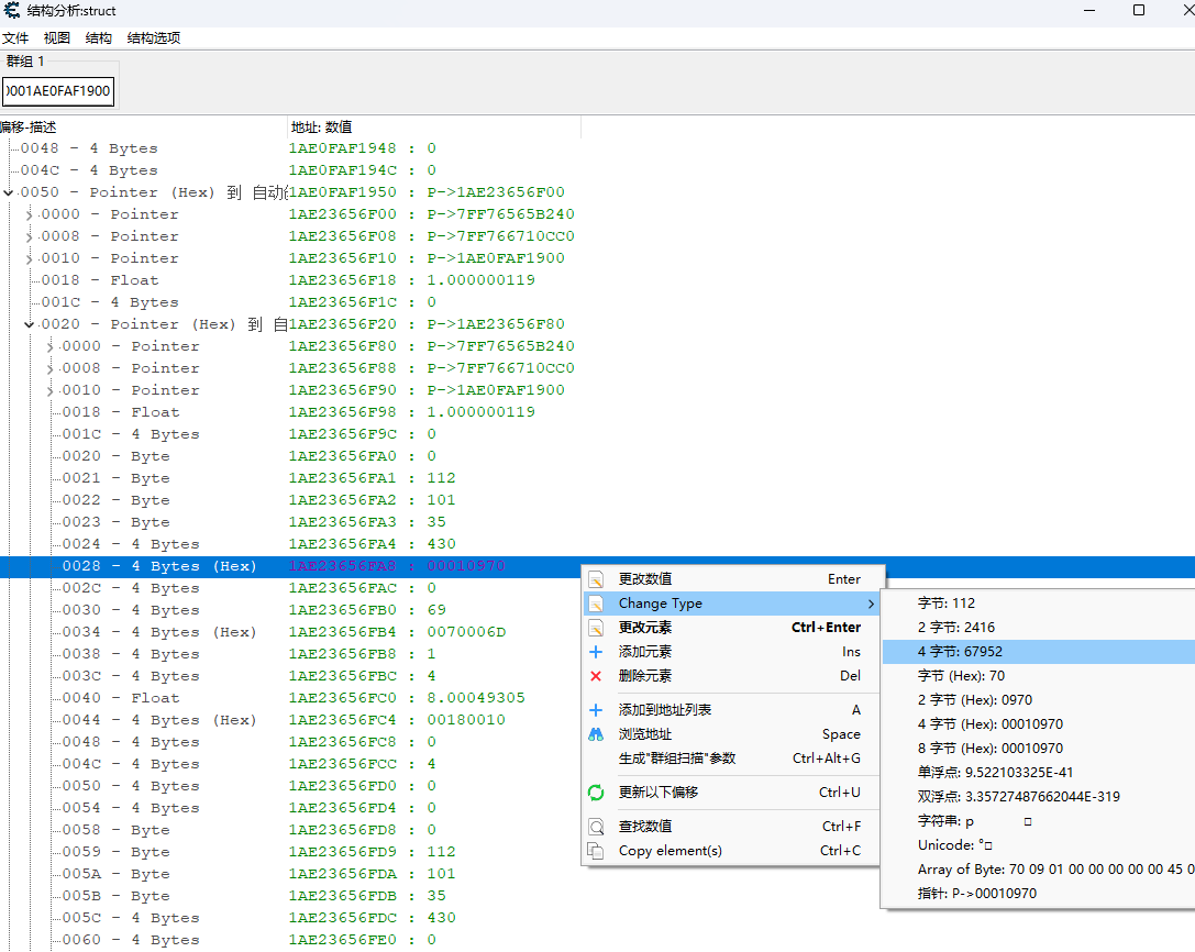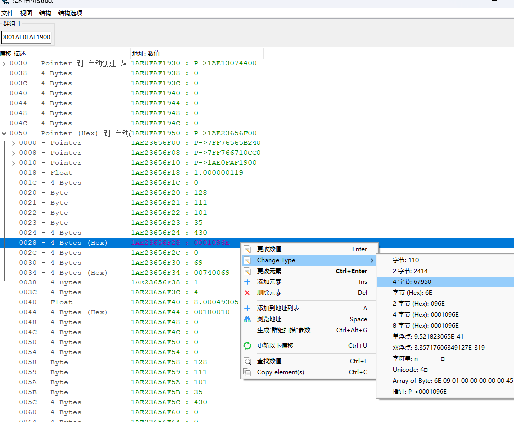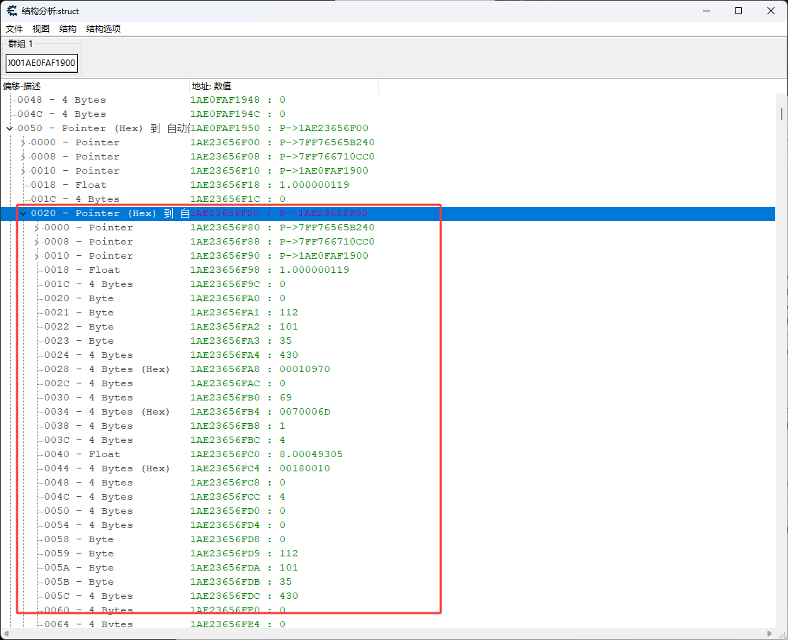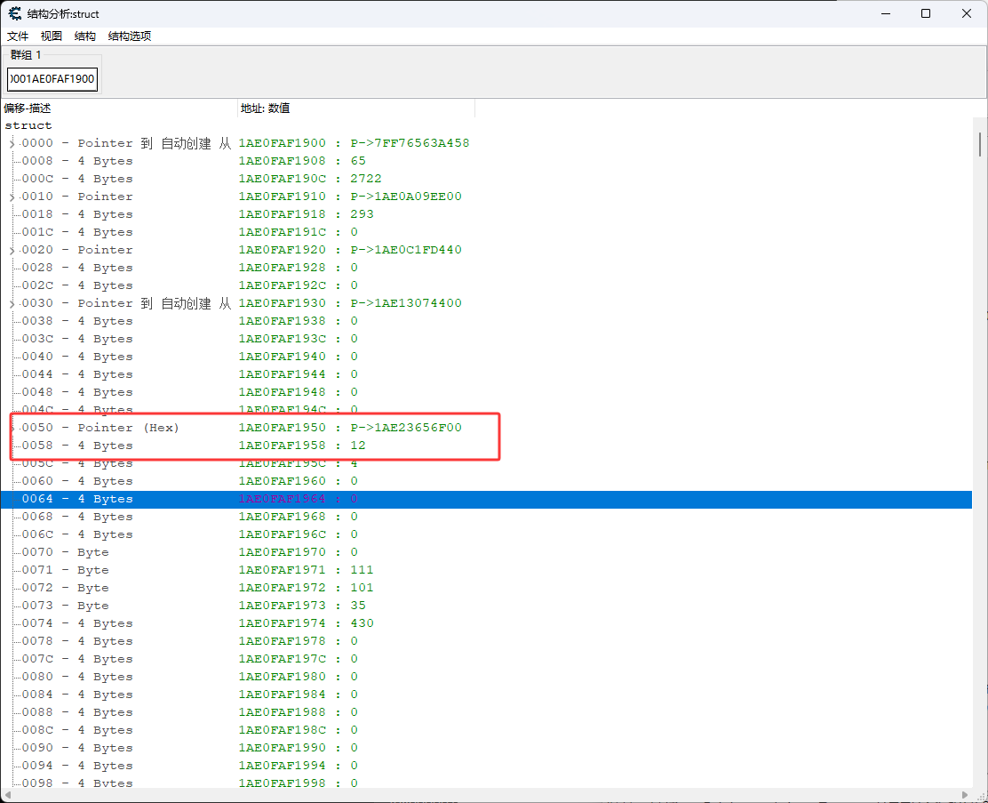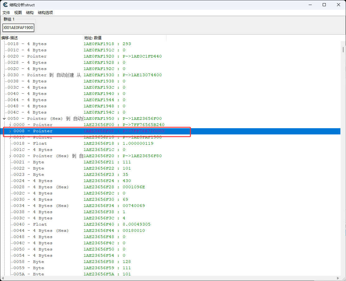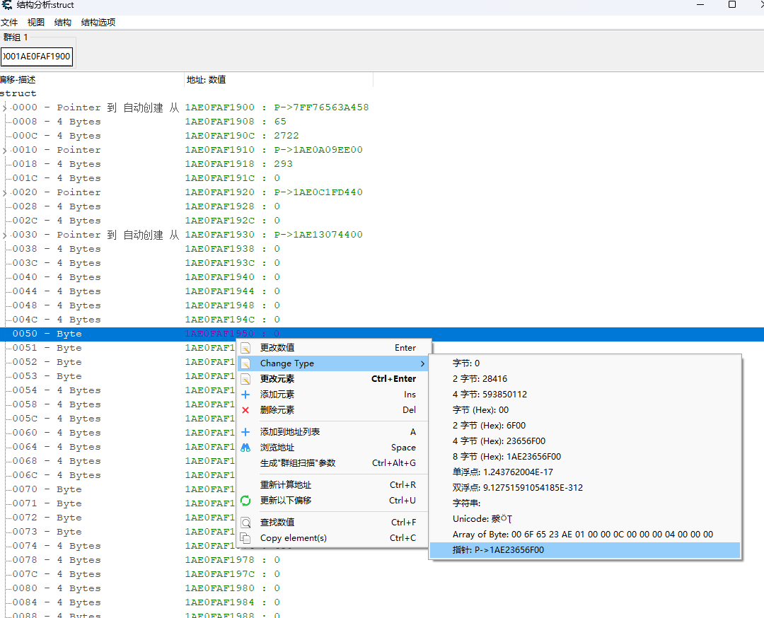 然后在0x50位置右击选择指针,如下图可以看到0x50位置的值是1AE23656F00这与其它的地址开头是一样的,所以就可以认定是CE分析的有问题,把地址分析成了普通数据