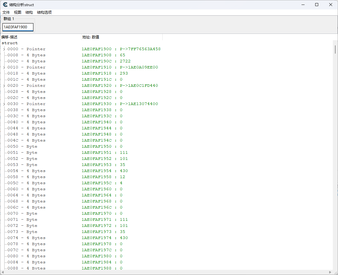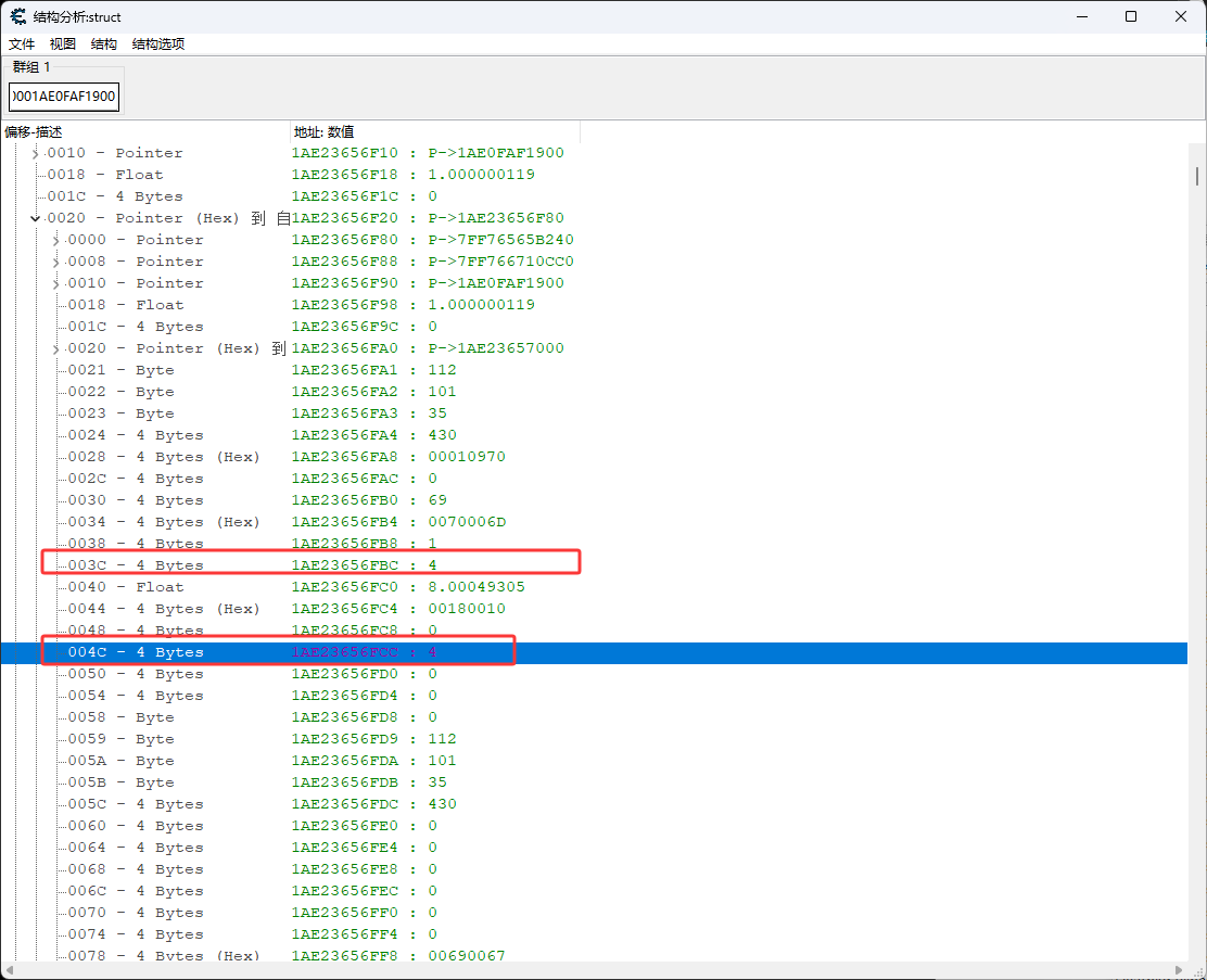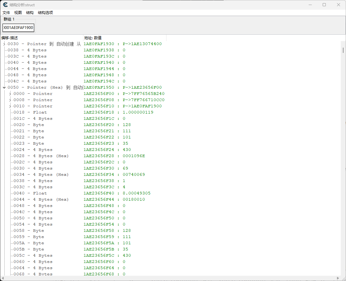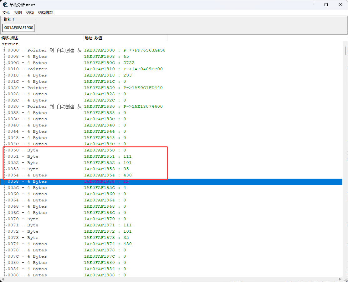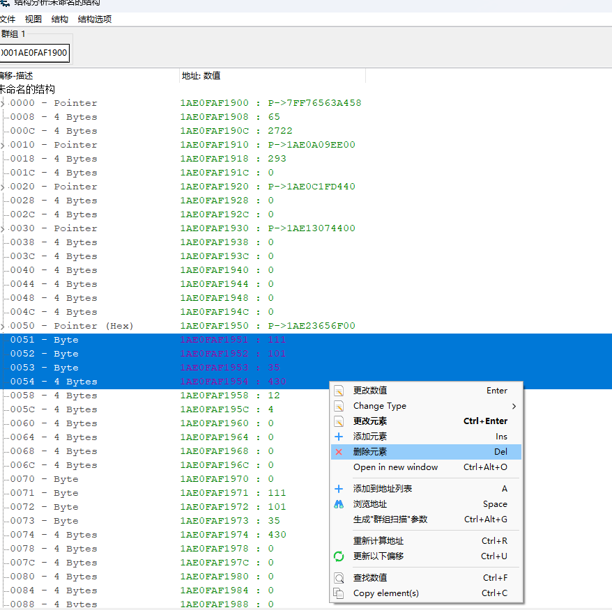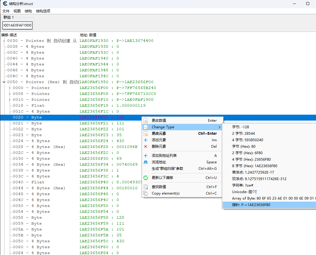 然后在0x50位置右击选择指针,如下图可以看到0x50位置的值是1AE23656F00这与其它的地址开头是一样的,所以就可以认定是CE分析的有问题,把地址分析成了普通数据