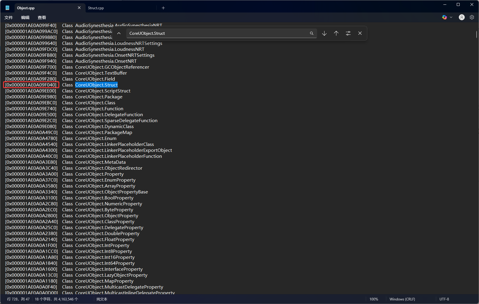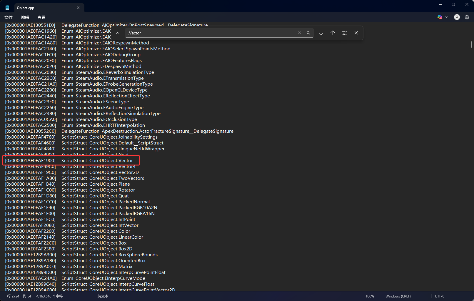 接下来就来找UStruct、FField、FProperty这三个东西,然后通过CoreUObject.Vector来找,它是坐标的结构(x、y、z),它们的类型是float是4字节,然后3个4字节是12字节