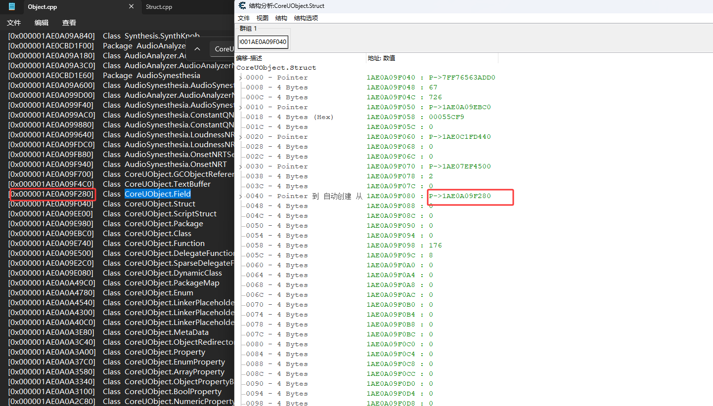 如下图红框0x40位置的地址是可以和CoreUObject.Field的地址对上