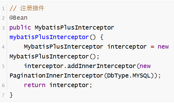 public class MyBatisPlusConfig {@Beanpublic MybatisPlusInterceptor mybatisPlusInterceptor() {MybatisPlusInterceptor interceptor = new MybatisPlusInterceptor();// 添加分页插件,指定数据库类型(如 MySQL)interceptor.addInnerInterceptor(new PaginationInnerInterceptor(DbType.MYSQL));return interceptor;}