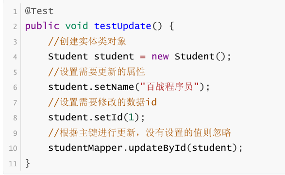 void testUpdate() {Student student = new Student();student.setId(1L); // 主键必须设置student.setAge(21); // 仅更新 age 字段int result = studentMapper.updateById(student);System.out.println("更新结果:" + result);