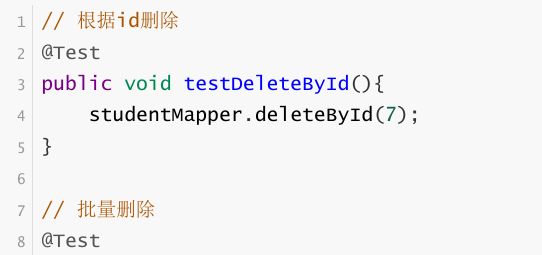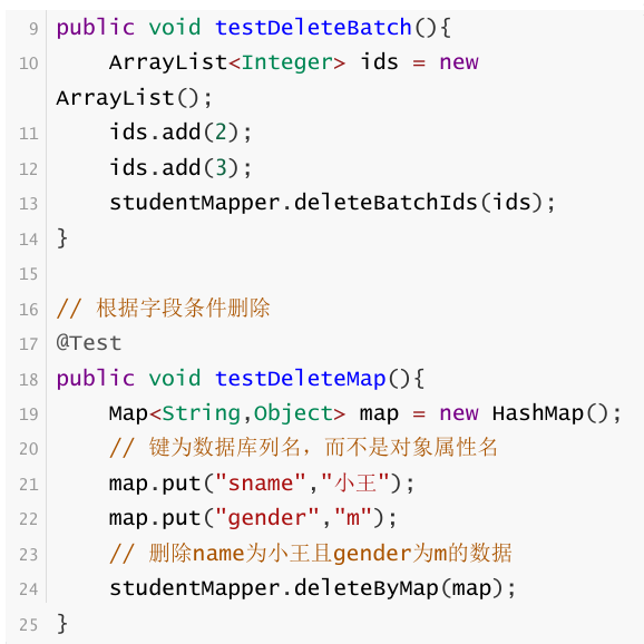 void testDelete() {// 1. 按主键删除int result1 = studentMapper.deleteById(1L);// 2. 批量删除List<Long> idList = Arrays.asList(2L, 3L);int result2 = studentMapper.deleteBatchIds(idList);// 3. 按条件删除(Map 传条件,键是数据库列名)Map<String, Object> condition = new HashMap<>();condition.put("age", 20);int result3 = studentMapper.deleteByMap(condition);