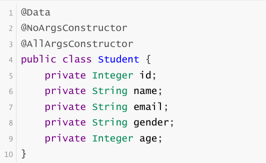 public class Student {private Long id;private String name;private String email;private String gender;private Integer age;