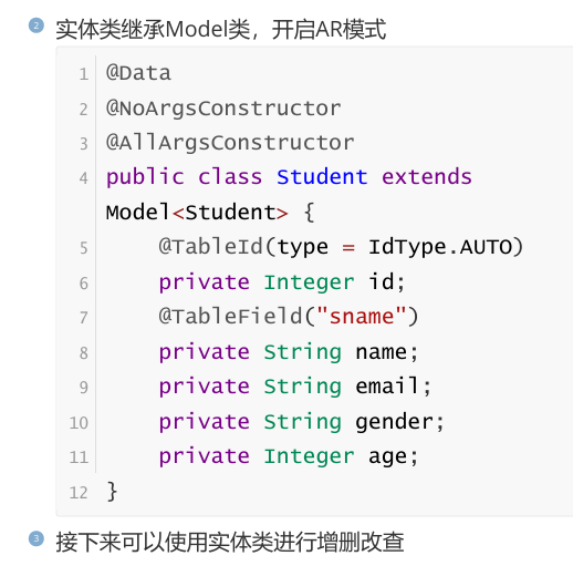 AR 模式让实体类自身拥有数据库操作能力,无需通过 Mapper 调用方法。
