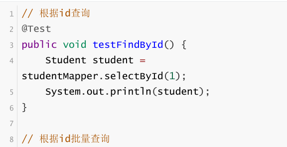 class StudentMapperTest {@Autowiredprivate StudentMapper studentMapper;@Testvoid testSelectById() {Student student = studentMapper.selectById(1L);System.out.println(student);}