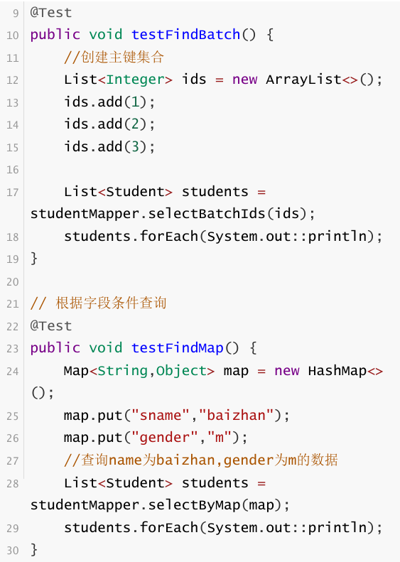 void testSelect() {// 1. 按主键查询Student student = studentMapper.selectById(1L);// 2. 批量查询List<Long> idList = Arrays.asList(1L, 2L, 3L);List<Student> students = studentMapper.selectBatchIds(idList);// 3. 按条件查询(Map 传条件)Map<String, Object> condition = new HashMap<>();condition.put("gender", "男");List<Student> maleStudents = studentMapper.selectByMap(condition);
