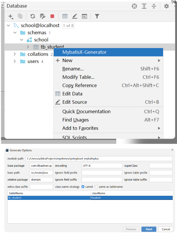 )可读取数据库表,自动生成实体类、Mapper、Service、Controller等代码,极大节省重复劳动。