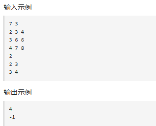 public class FloydBase {// public static int MAX_VAL = Integer.MAX_VALUE;// 边的最大距离是10^4(不选用Integer.MAX_VALUE是为了避免相加导致数值溢出)public static int MAX_VAL = 10005; public static void main(String[] args) {// 输入控制Scanner sc = new Scanner(System.in);System.out.println("1.输入N M");int n = sc.nextInt();int m = sc.nextInt();System.out.println("2.输入M条边");// ① dp定义(grid[i][j][k] 节点i到节点j 可能经过节点K(k∈[1,n]))的最短路径int[][][] grid = new int[n + 1][n + 1][n + 1];for (int i = 1; i <= n; i++) {for (int j = 1; j <= n; j++) {for (int k = 0; k <= n; k++) {grid[i][j][k] = grid[j][i][k] = MAX_VAL; // 其余设置为最大值}}}// ② dp 推导:grid[i][j][k] = min{grid[i][k][k-1] + grid[k][j][k-1], grid[i][j][k-1]}while (m-- > 0) {int u = sc.nextInt();int v = sc.nextInt();int weight = sc.nextInt();// 初始化(处理k=0的情况) ③ dp初始化grid[u][v][0] = grid[v][u][0] = weight; }// ④ dp推导:floyd 推导for (int k = 1; k <= n; k++) {for (int i = 1; i <= n; i++) {for (int j = 1; j <= n; j++) {grid[i][j][k] = Math.min(grid[i][k][k - 1] + grid[k][j][k - 1], grid[i][j][k - 1]);}}}System.out.println("3.输入[起点-终点]计划个数");int x = sc.nextInt();System.out.println("4.输入每个起点src 终点dst");while (x-- > 0) {int src = sc.nextInt();int dst = sc.nextInt();// 根据floyd推导结果输出计划路径的最小距离if (grid[src][dst][n] == MAX_VAL) {System.out.println("-1");} else {System.out.println(grid[src][dst][n]);}}}