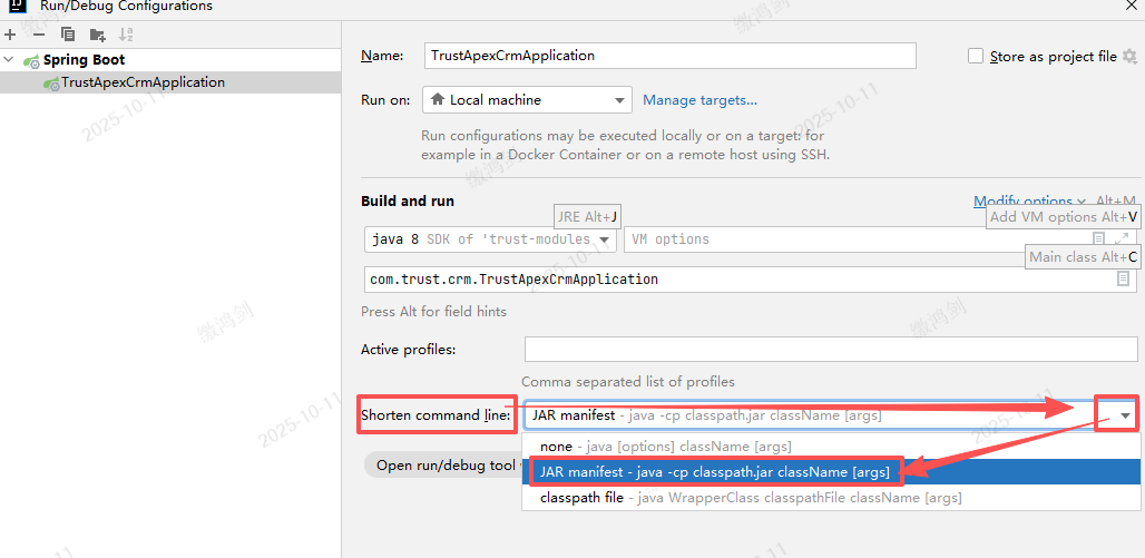 当在运行 Java 应用程序(如 TrustApexCrmApplication)时遇到 "Command line is too long" 错误,这通常是因为类路径(classpath)太长导致的。