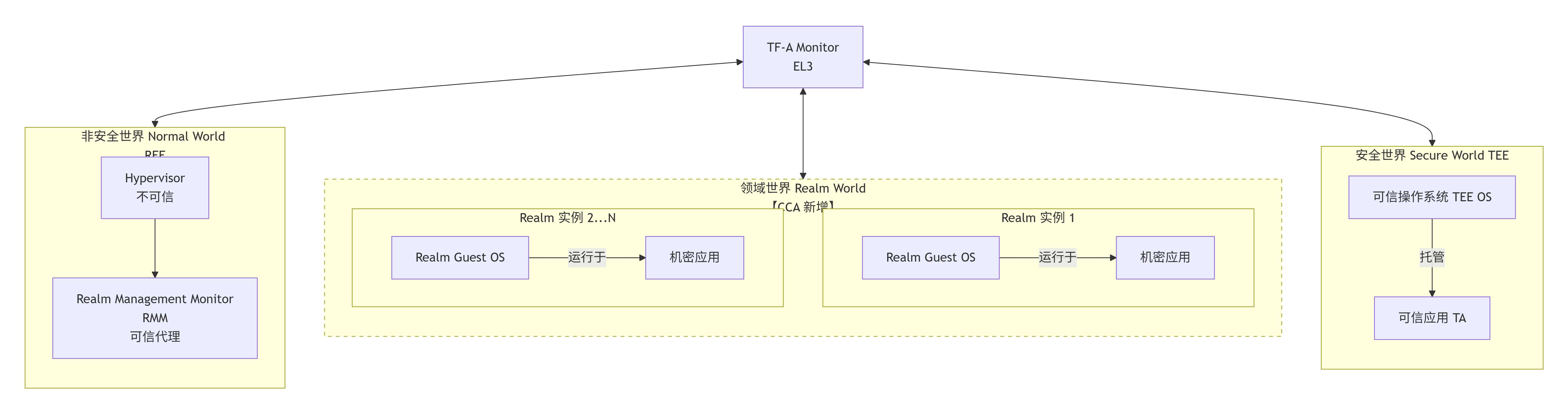职能的扩展:【在传统 TEE/REE 模型中,Monitor 主要负责 REE 和 TEE 这两个世界之间的上下文切换】。在 CCA 中,它的职责扩展为管理 Non-Secure, Secure, 和 Realm 这三个世界之间的所有安全切换。