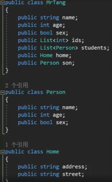 {public string name;public int age;public bool sex;public float testF;public double testD;public int[] ids;public List<int> ids2;public Dictionary<string, string> dic2;public Student2 s1;public List<Student2> s2s;private int privateI = 1;protected int protectedI = 2;