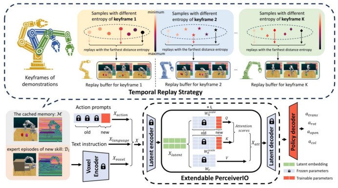图3. iManip的整体框架,主要包括一个时间回放策略,用于为旧演示的每个关键帧存储具有最远距离熵的样本,以及一个可扩展的PerceiverIO,它由带有可扩展权重的动作提示组成,以适应新的动作基元。