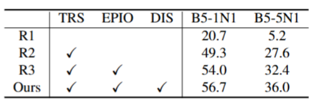 消融实验设计:设置4组对照实验(无任何增量策略R1、仅时序重放R2、时序重放+可扩展PerceiverIO R3、完整框架Ours);