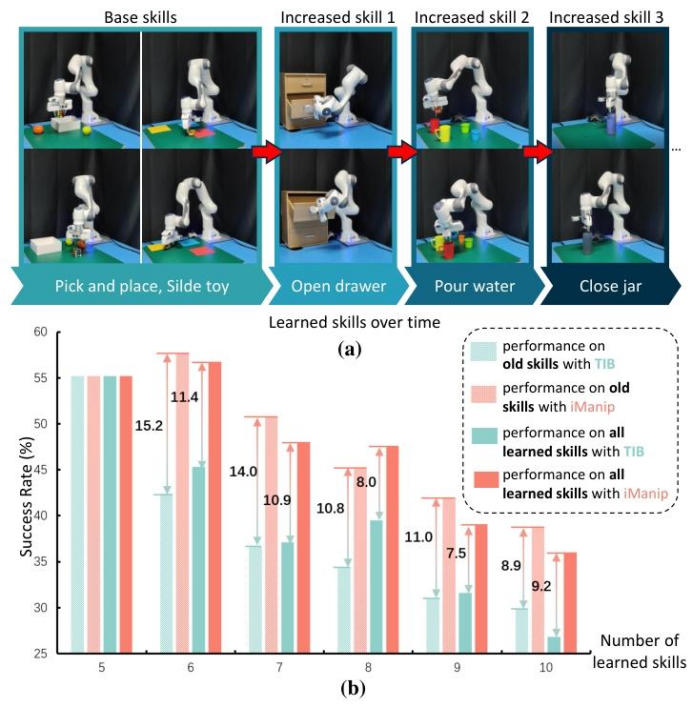 中山大学计算机学院联合鹏城实验室、教育部机器智能与先进计算重点实验室,以Franka 机械臂为核心实验载体,提出了iManip 技能增量学习框架。