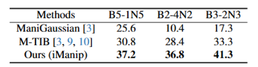 研究团队通过 “性能对比实验”“消融实验”“多场景泛化实验”,系统性验证 iManip 框架对核心挑战的解决效果: