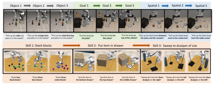 仿真环境:基于RLBench基准构建技能增量环境,选取10项语言约束操作技能(如关罐子、扫入簸箕、堆叠方块),每项技能包含2-60种变体(颜色、尺寸、位置等),总计166种操作场景;