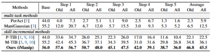 表1. Rlbench中B5-5N1不同方法的性能比较。我们展示了旧技能和所有已学习技能的平均成功率,以及所有新步骤的平均性能。基线[1, 3]上的传统增量方法[9, 10]被称为TIB。