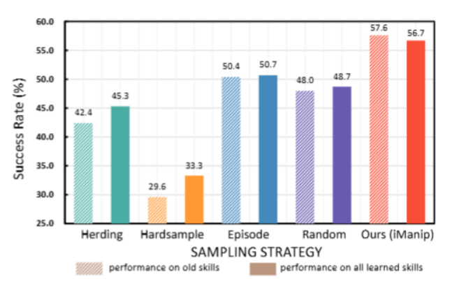 验证逻辑:若iManip能在 “学习新技能后保持旧技能高成功率”,则证明其缓解了灾难性遗忘;