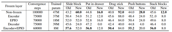 表3.五组B5-1N1实验的性能,这些实验具有相同的基础技能和不同的新技能,同时冻结不同的网络层。对于每个新技能,我们总共训练100k次迭代,并报告平均成功率和平均模型收敛步数。