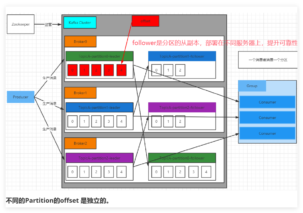 多副本机制:每个 Partition 的数据都有多个副本,分散在不同机器上,防止单点故障。