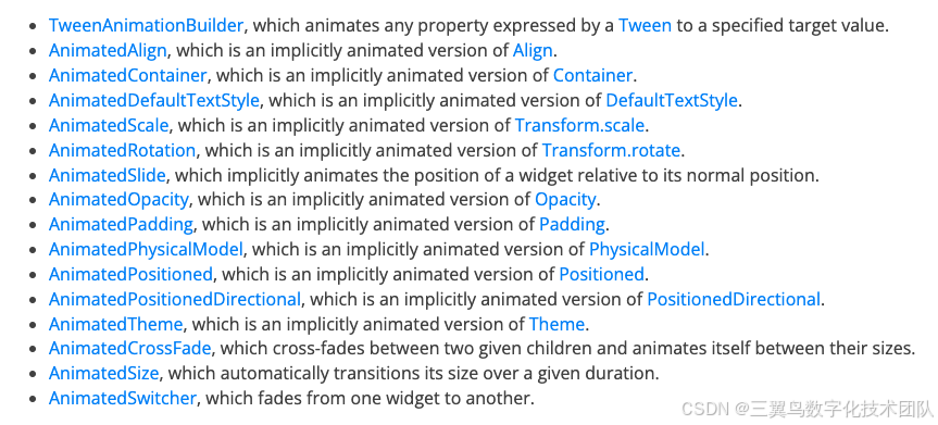 通过使用 Flutter 的 动画库,你可以为 UI 中的组件添加运动和创建视觉效果。你可以使用库中的一套组件来管理动画,这些组件统称为隐式动画或隐式动画组件,其名称源于它们都实现了 ImplicitlyAnimatedWidget 类。使用隐式动画,你可以通过设置一个目标值,驱动 widget 的属性进行动画变换;每当目标值发生变化时,属性会从旧值逐渐更新到新值。通过这种方式,隐式动画内部实现了动画控制,从而能够方便地使用— 隐式动画组件会管理动画效果,用户不需要再进行额外的处理。