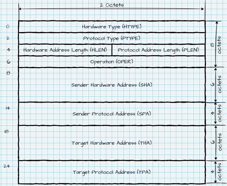 ARP 协议用于根据主机的 IP 地址确定其物理接口的 MAC 地址。该协议在RFC 826 — 以太网地址解析协议中进行了描述。MAC 地址不一定是以太网网络地址,但以下是以太网 ARP 消息的结构。