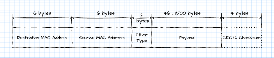 您经常会看到有关最小以太网帧大小、前导码和校验和的信息。然而,这涉及到网络适配器驱动程序的实现或适配器本身的硬件实现,因此本文不做讨论。对我们来说,以太网帧包含接收方的 MAC 地址、发送方的 MAC 地址、帧类型以及数据本身。