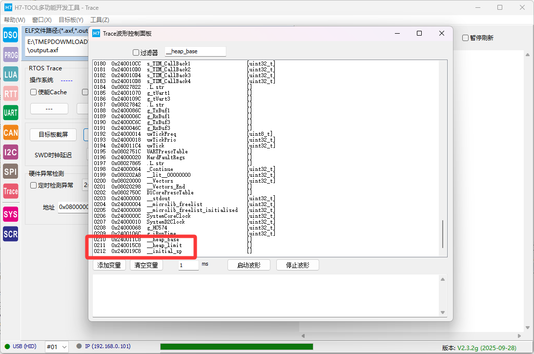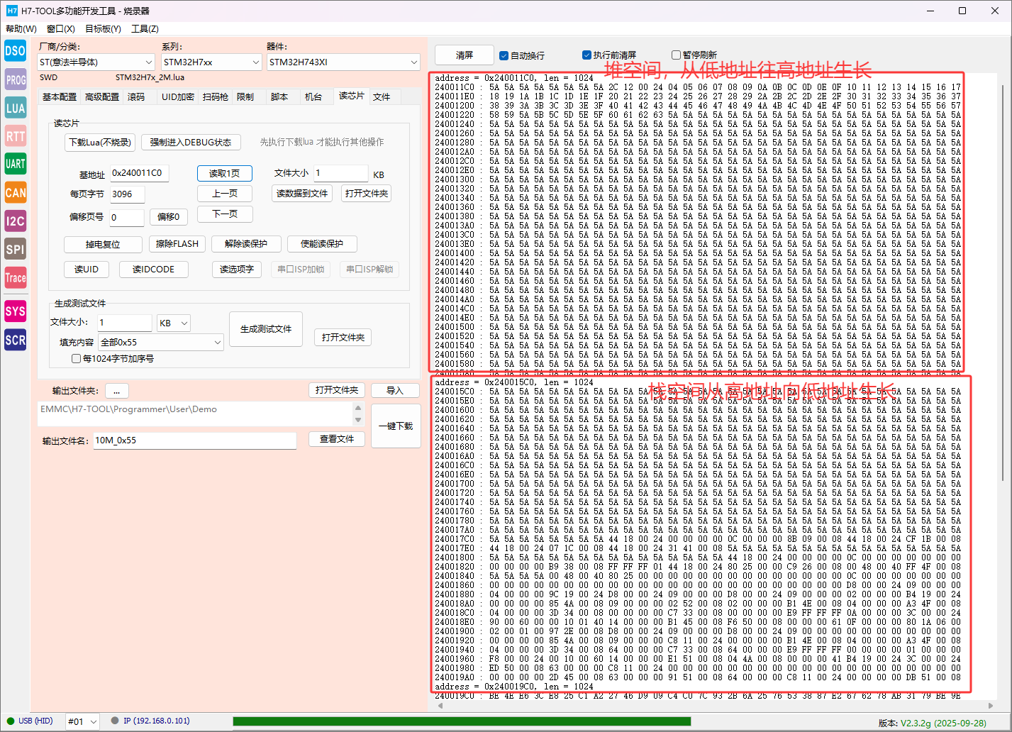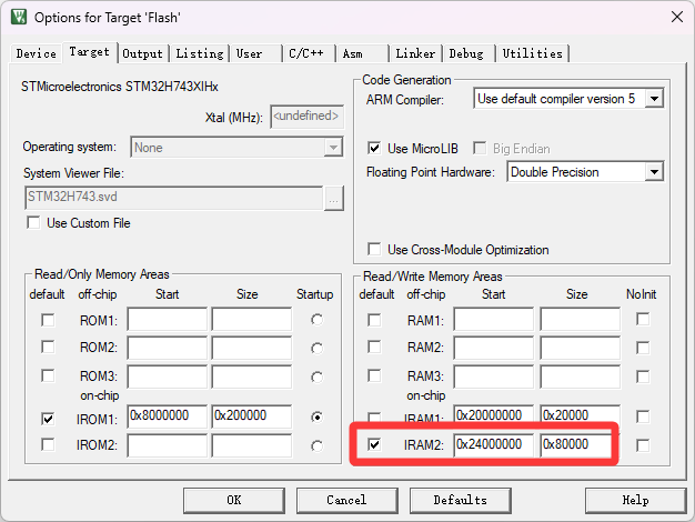 比如STM32H743/H750系列,他有多个RAM空间,这里我们将需要快速执行的堆栈空间分配到DTCM, 0x2000 0000,128KB容量末尾。程序主RAM分配到AXI SRAM, 0x2400 0000,512KB容量
